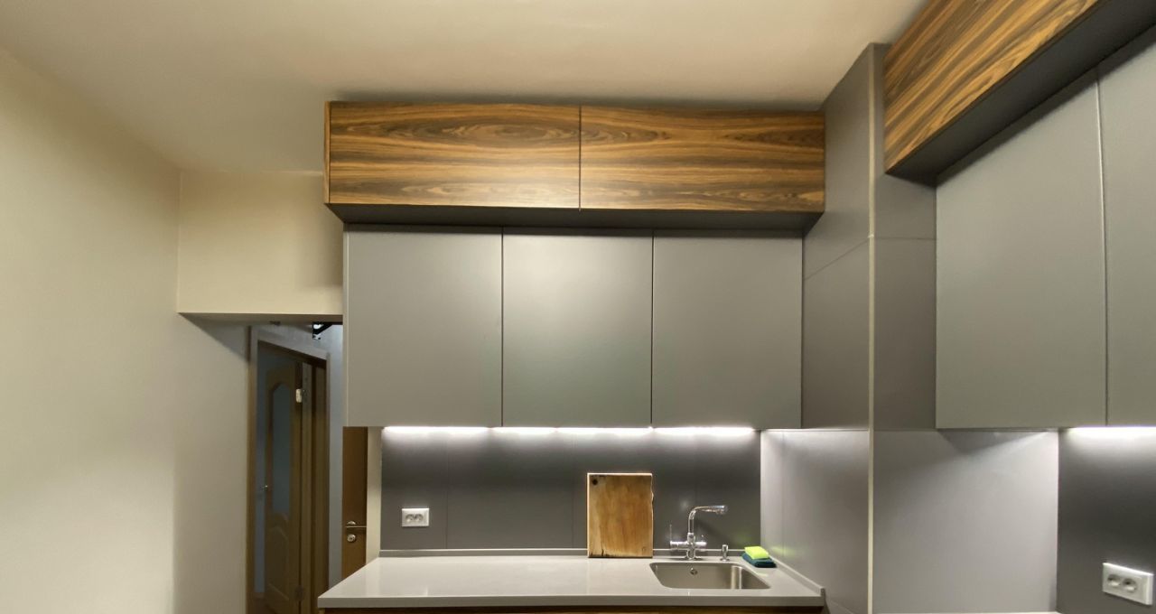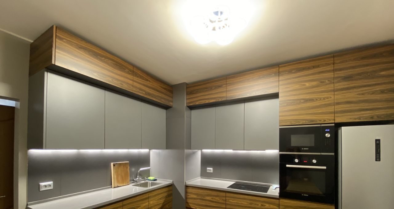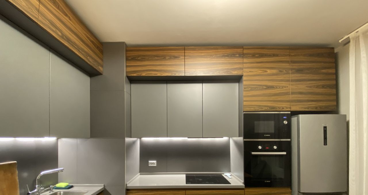 Кухонных гарнитур из шпонированного дуба, фурнитура Blum, посудомоечная машина, встроенная микроволновка Bosh, обеденный стол из натурального слэба вяза.