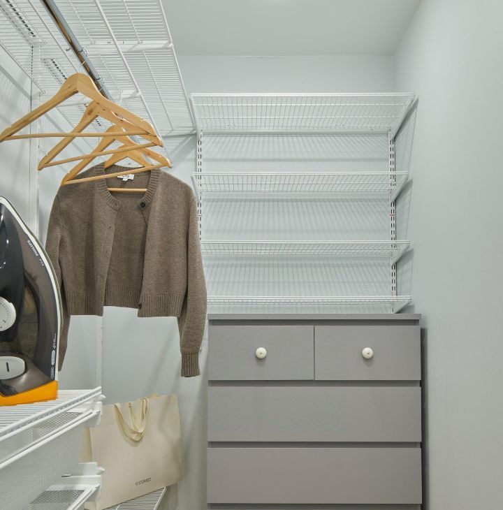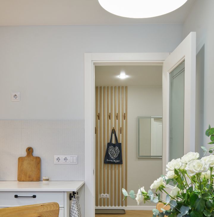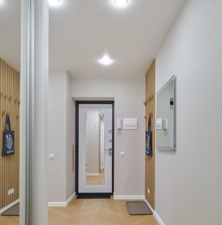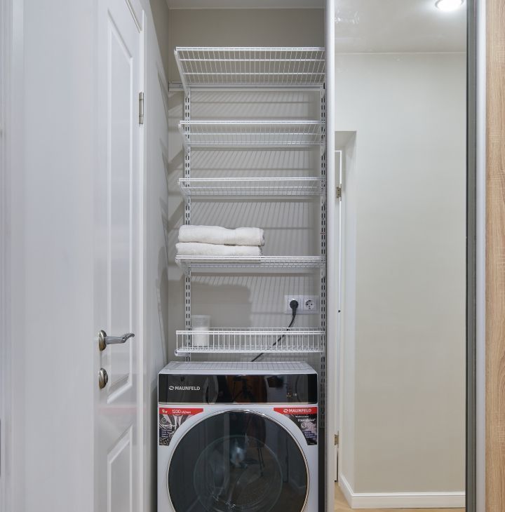 В прихожей предусмотрен просторный гардеробный шкаф со стиральной машиной с функцией сушка белья.