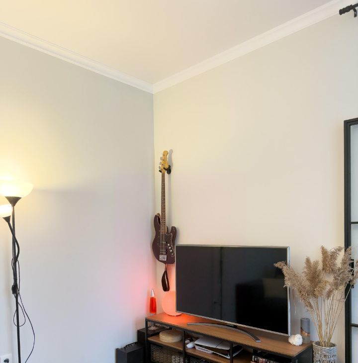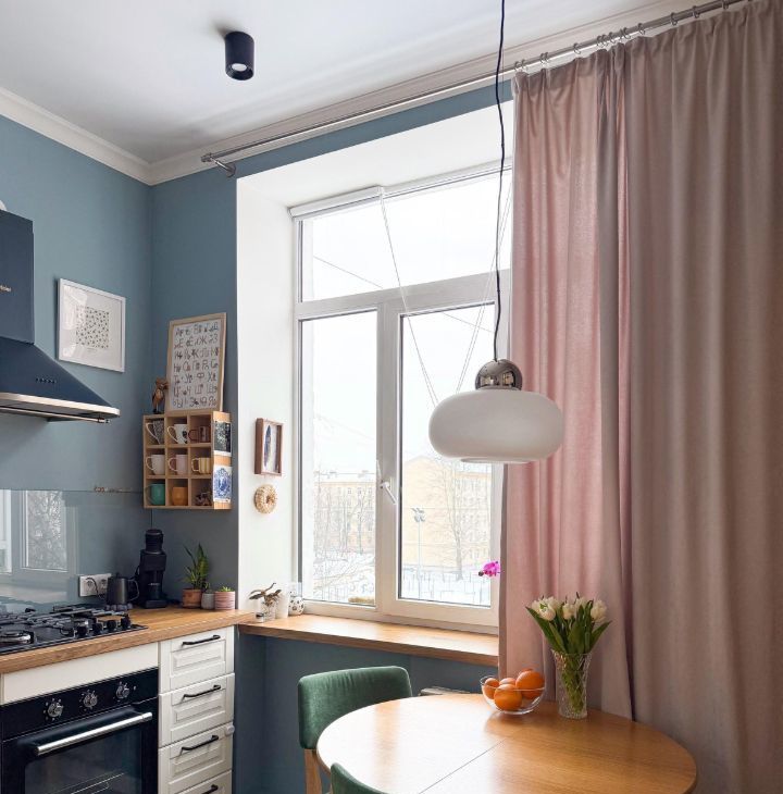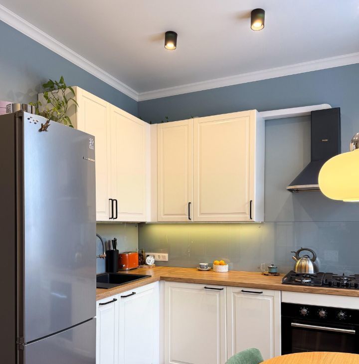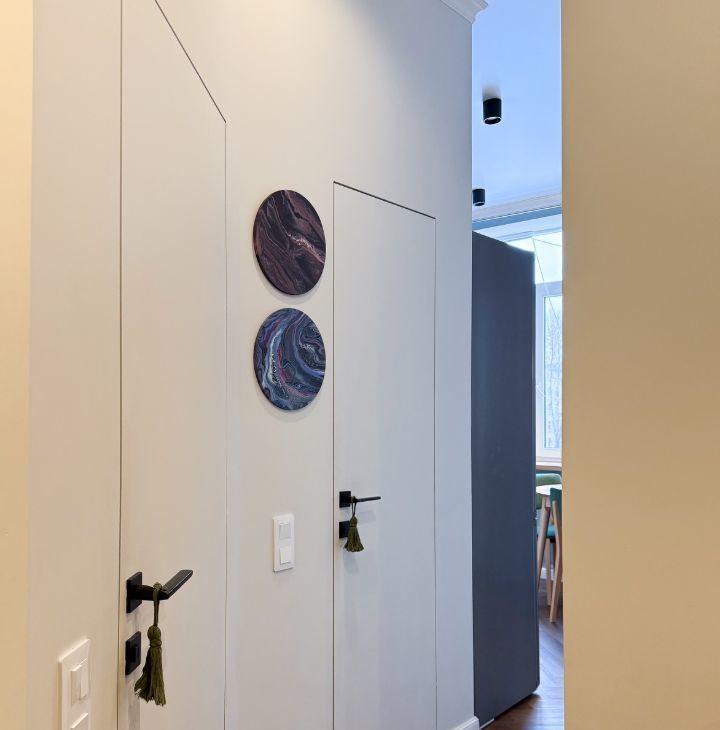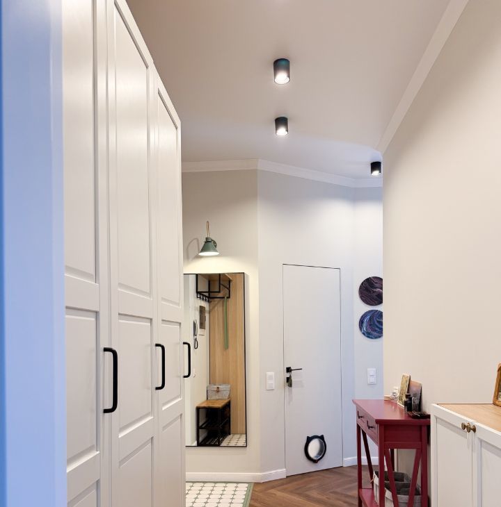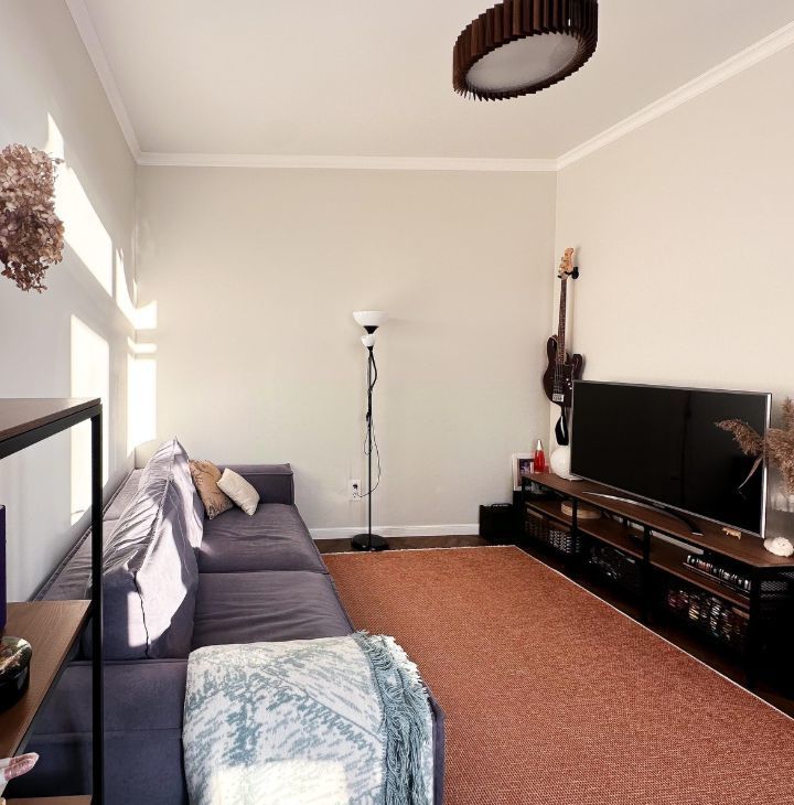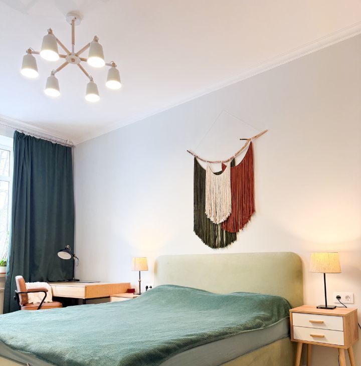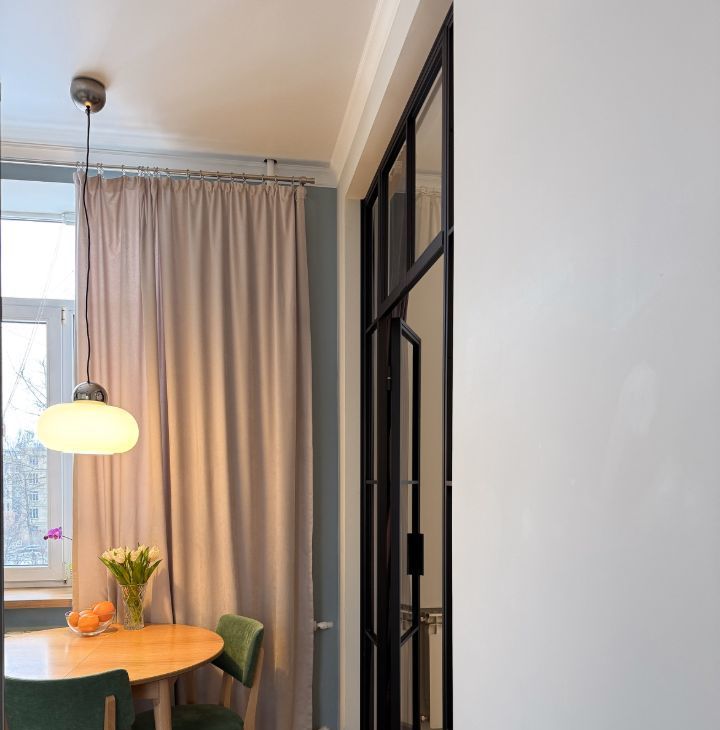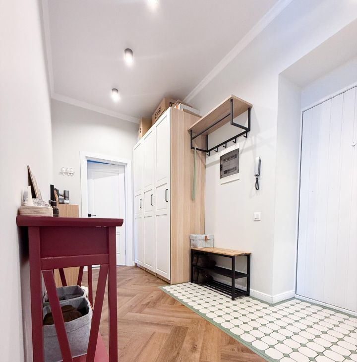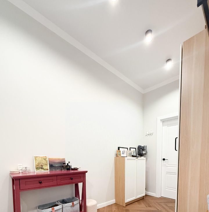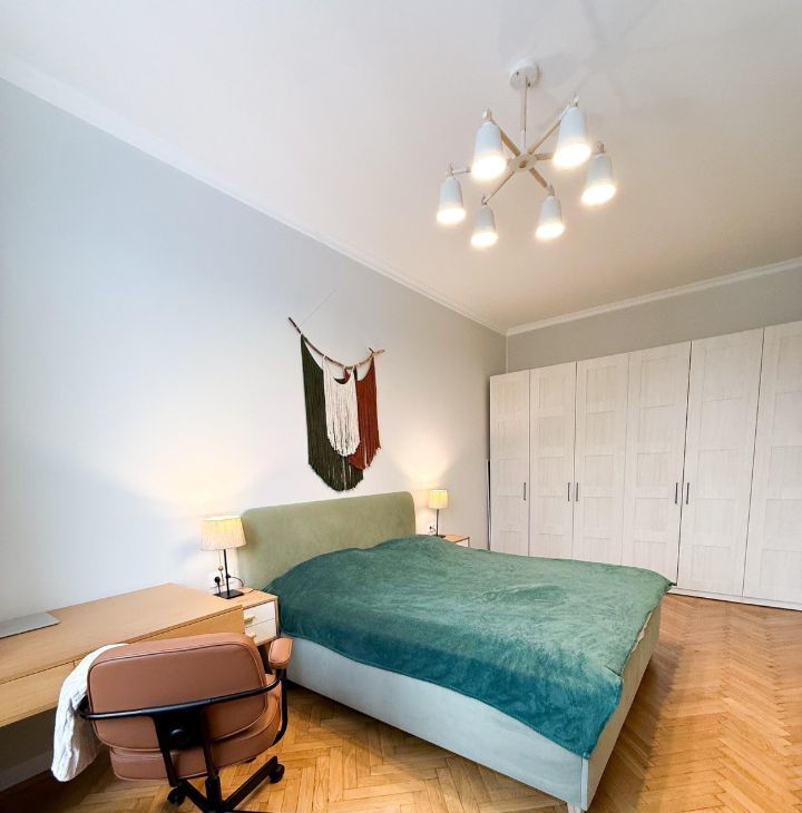 Стены оформлены под покраску, на полу надежное и прочное покрытие из кварцвинила. В спальне отреставрирован родной паркет из дуба.