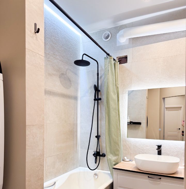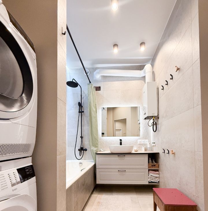 Квартира оснащена газовой колонкой Bosch, что обеспечивает бесперебойную подачу горячей воды.