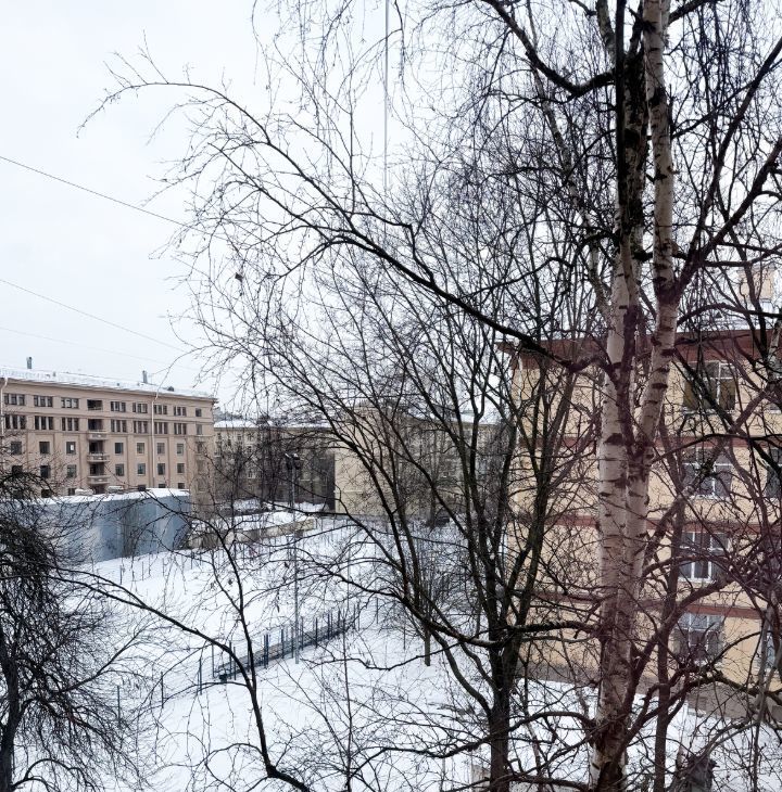 Квартира выходит окнами на зеленый двор школы, все жилые дома расположены вдали.