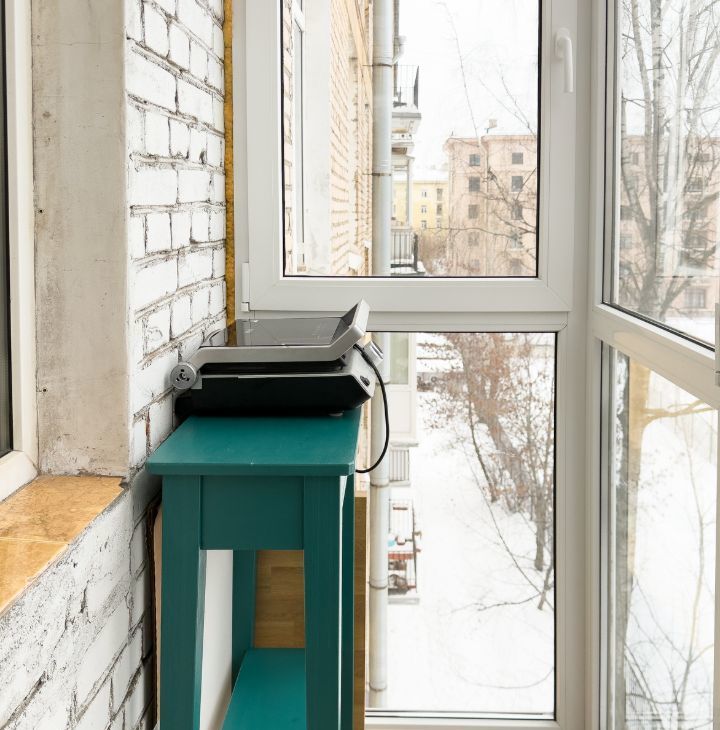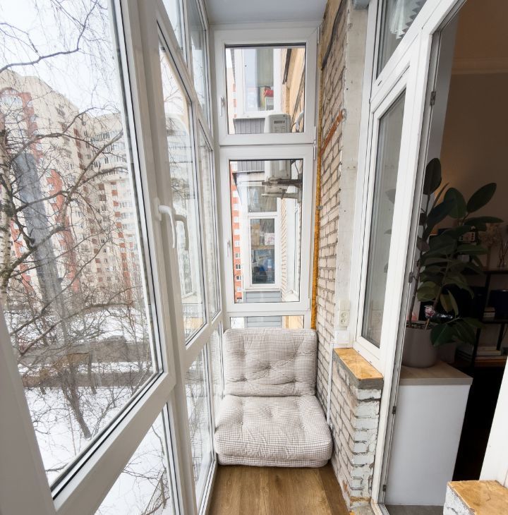 На балконе выполнен ремонт, сделано панорамное остекление, теплый пол и освещение.