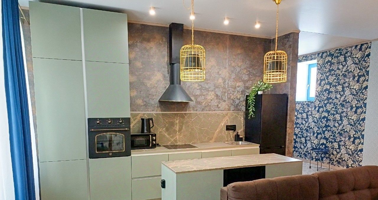 Квартира оснащена кухонным гарнитуром, всей необходимой мебелью и бытовой техникой. Есть: