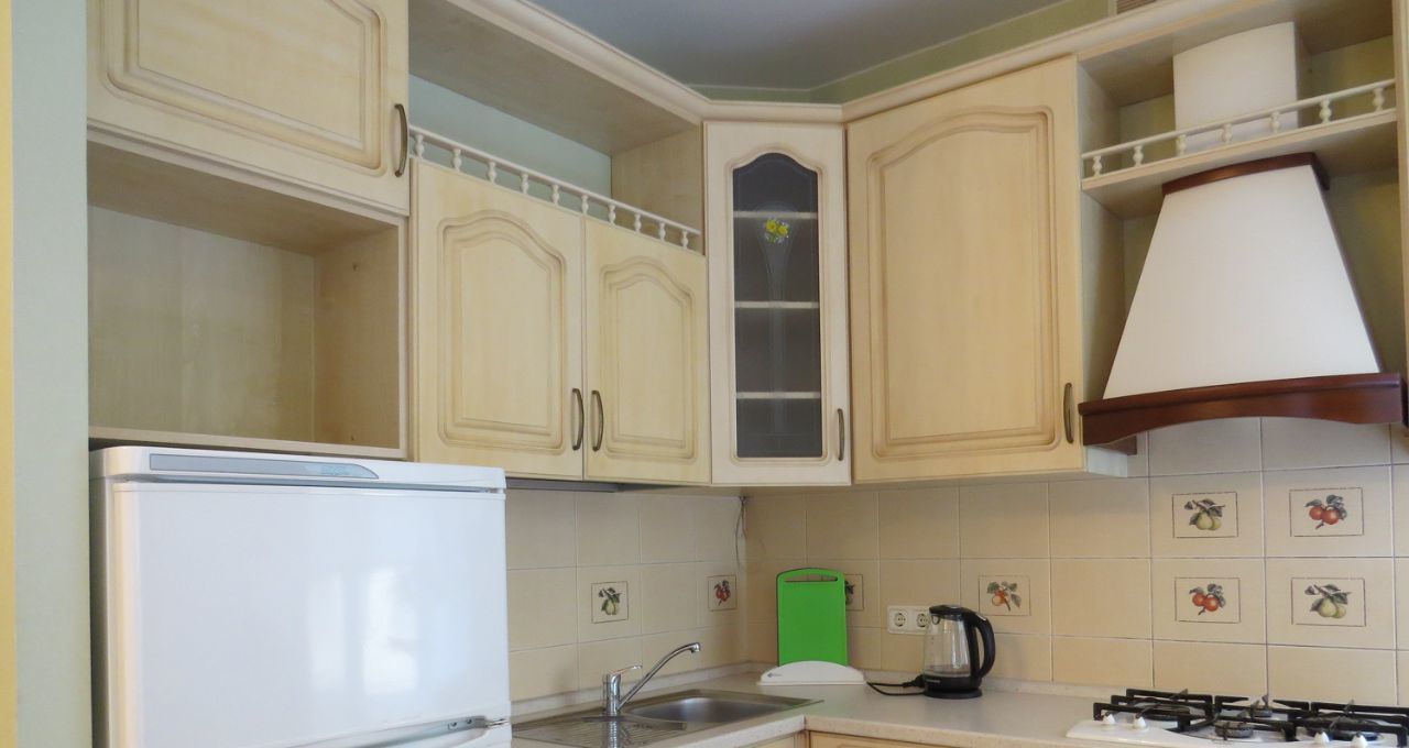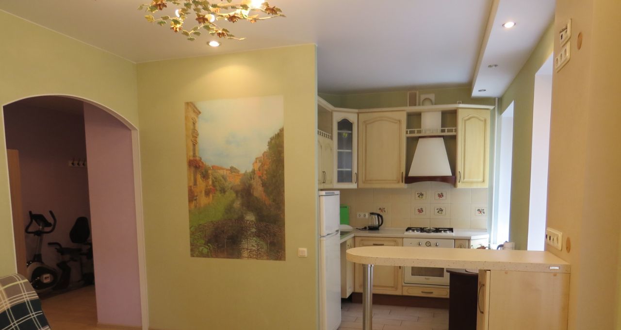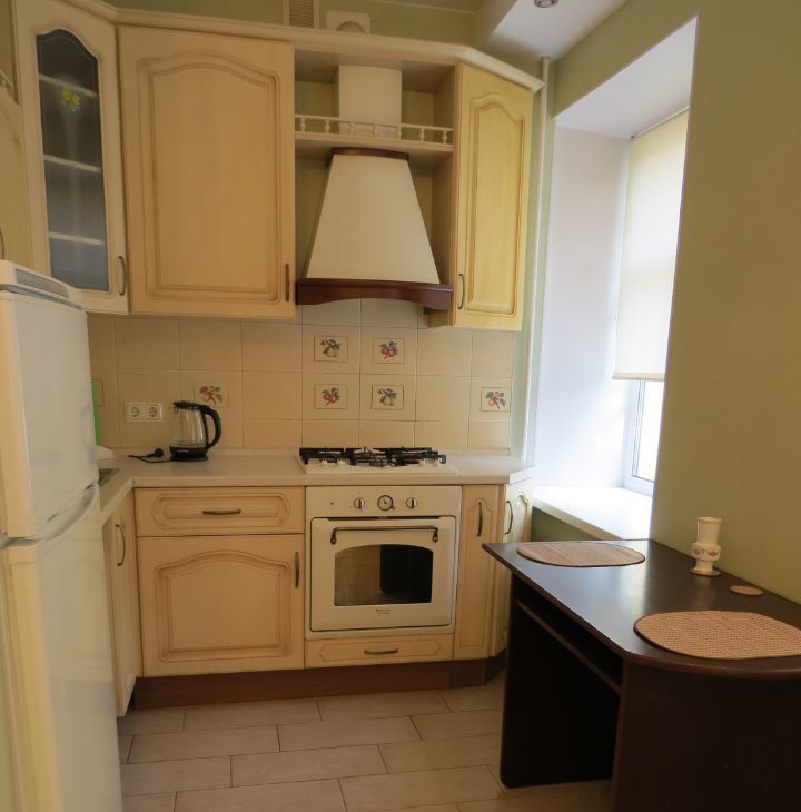 Полностью оборудованная кухня, газовая плита с электро-духовкой, посудомойка, холодильник.