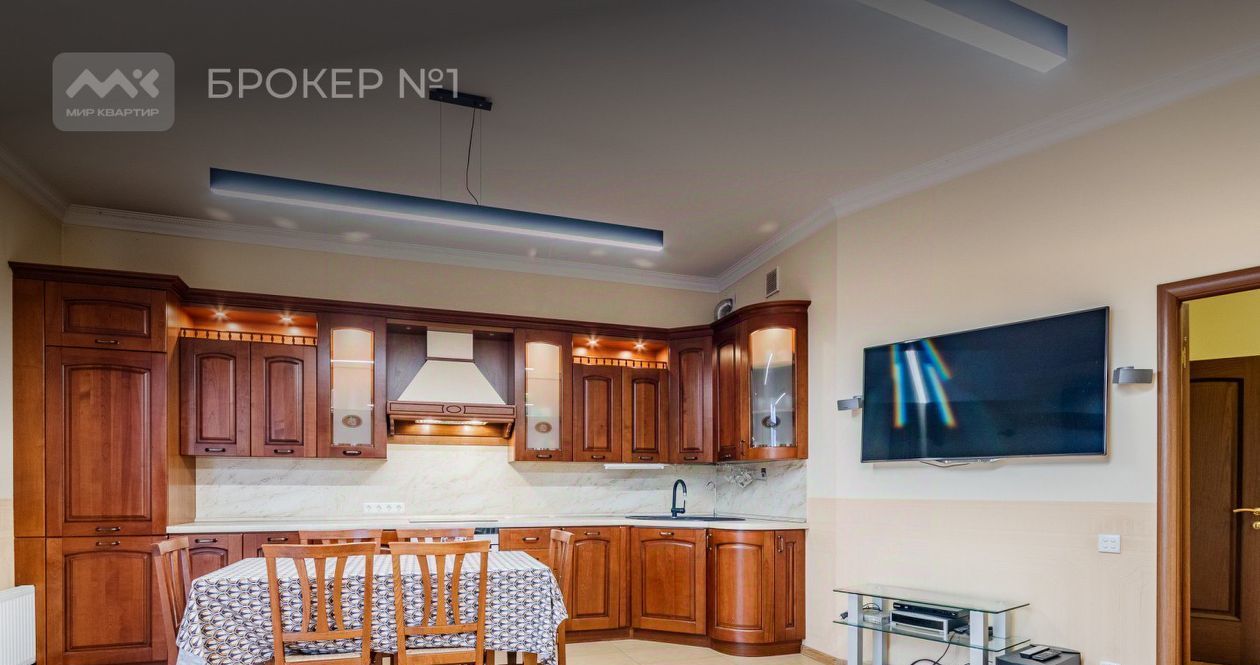 Евротрехкомнатная планировка квартиры общей площадью 125 квадратных метров велючает в себя две изолированные спальни и огромную кухню-гостиную. В одной из комнат можно уютно провести вечер у настоящего камина. Два санузла с гидромассажной ванной. Есть сауна, что является неоспоримым плюсом в холодное время года. Много мест для хранения. Высокие потолки.
