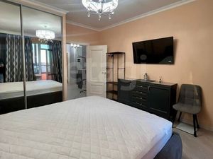 В спальне предусмотрена большая двуспальная кровать 180х200 с новым ортопедическим матрасом. Шторы блэкаут. Вместительный гардероб.