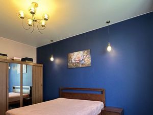 - В 1 комнате: двуспальная кровать, шкаф, комод, 2 тумбы, туалетный столик с зеркалом и кондиционер.