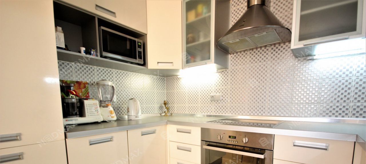 • Квартира оснащена импортной техникой: стиральной и посудомоечной машинами, холодильником, духовым шкафом и телевизором.