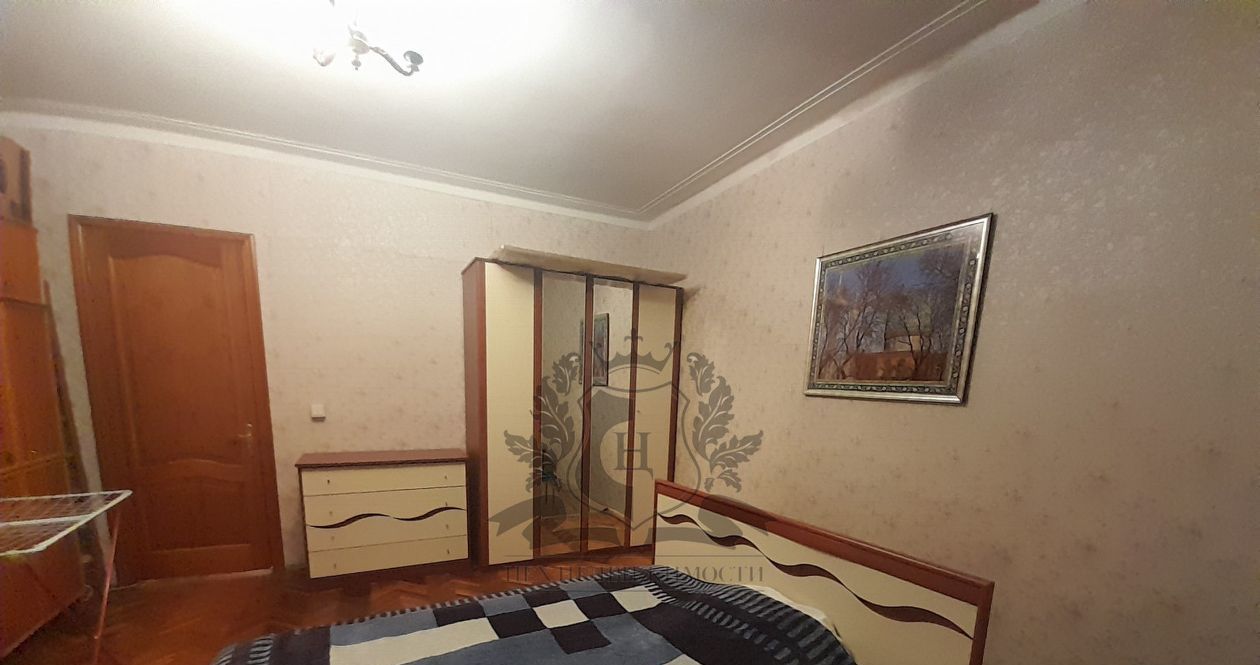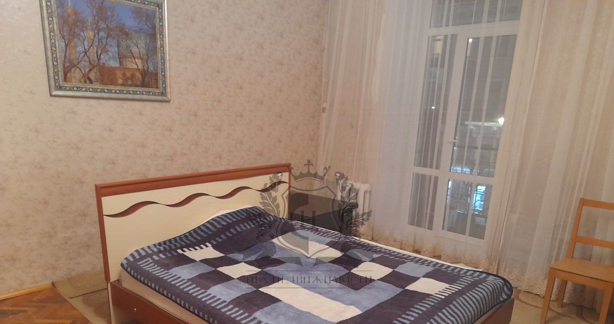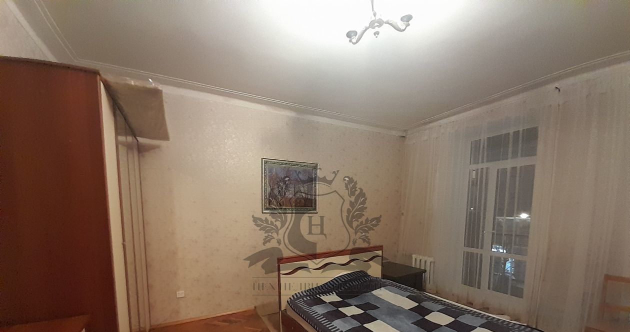 В спальне: кровать двухспальная, шкаф,комод ,столик, выход на балкон ,вид на ул. Чернышевского.