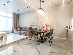 В квартире просторная кухня-гостиная с панорамными окнами в пол, что создает ощущение пространства и наполняет комнату естественным светом. Вид на живописную реку Ждановку добавляет особого уюта и красоты.