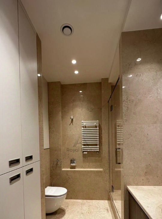 Современный санузел с душевой кабиной, продуманной системой хранения и безупречной отделкой.