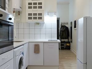 Комнаты просторные, светлые, в одной два окна, в другой одно большое. Кухня и гостиная объединены. Установлена кухонный модуль, включая посудомоечную машину, варочную поверхность, холодильник, микроволновку. В прихожей встроенный шкаф с зеркальными дверцами от пола до потолка. Отдельное помещение кладовка. Санузел совмещенный, установлена ванна, раковина, унитаз, стиральная машинка.