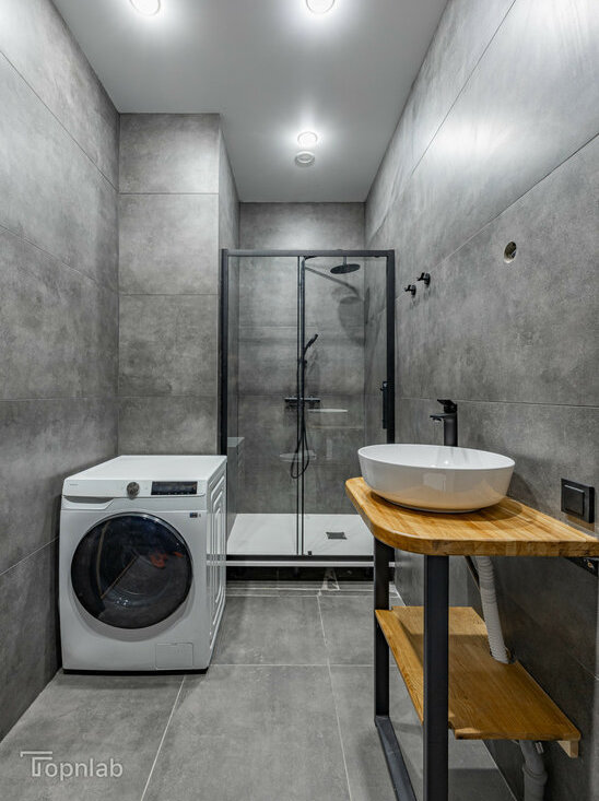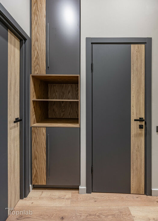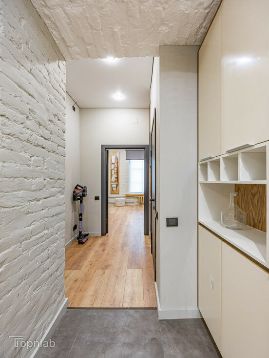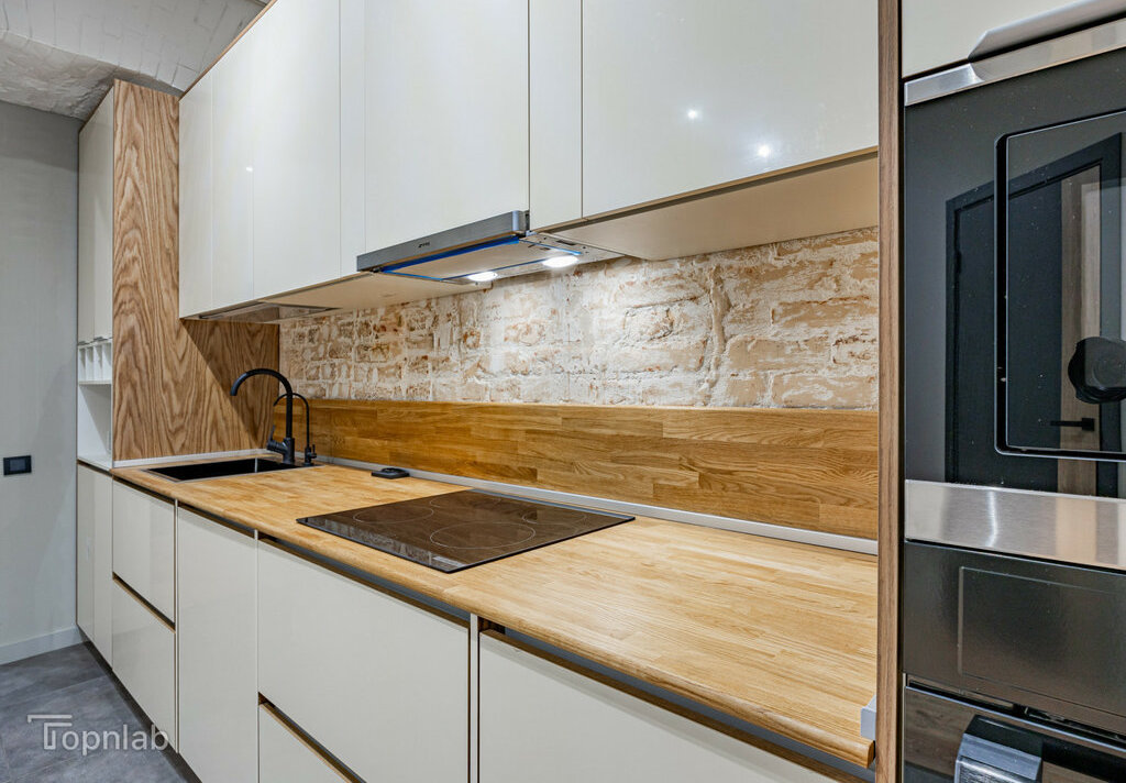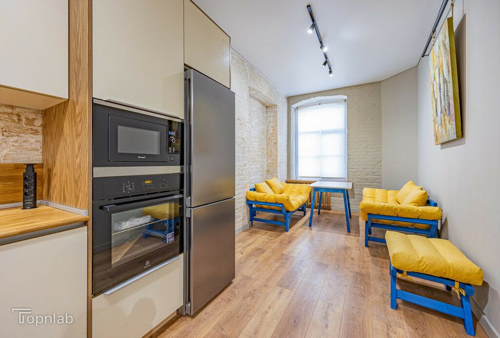 Встроенная кухня оборудована бытовой техникой и множеством мест хранения.