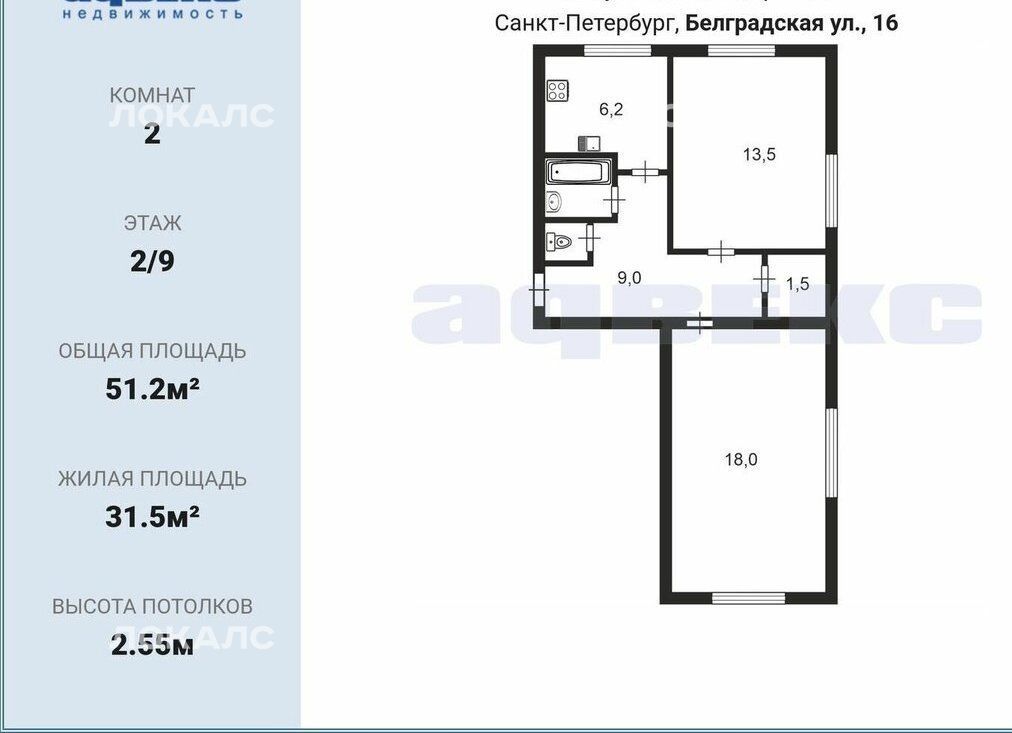 2-комнатная квартира: Санкт-Петербург, Белградская улица, 16 (51.2 м²)