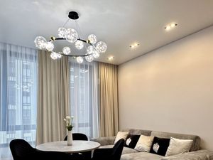 Панорамные окна, из которых можно любоваться всеми городскими салютами, не выходя из дома. По всему периметру квартиры установлены плотные шторы, кондиционер и полы с подогревом.