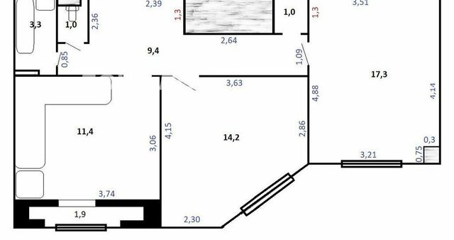 Плoщaдь застеклeннoй лoджии:1,9 кв.м