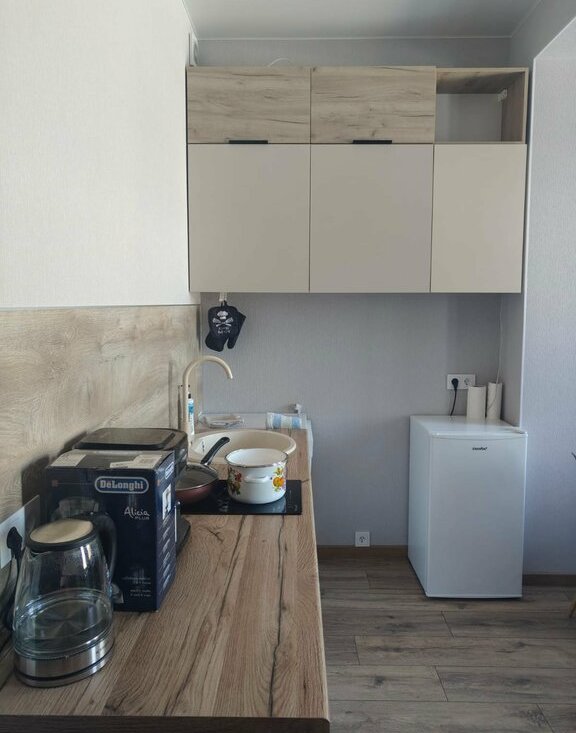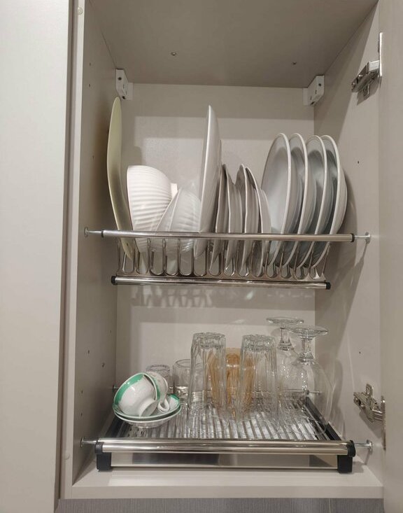 встроенная кухня, посудомоечная машина, стиральная машина, холодильник, аэрогриль, кофеварка, чайник, фен, посуда и текстиль.