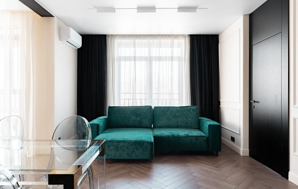 В гостиной установлен кондиционер, поддерживающий комфортную температуру в любое время года.