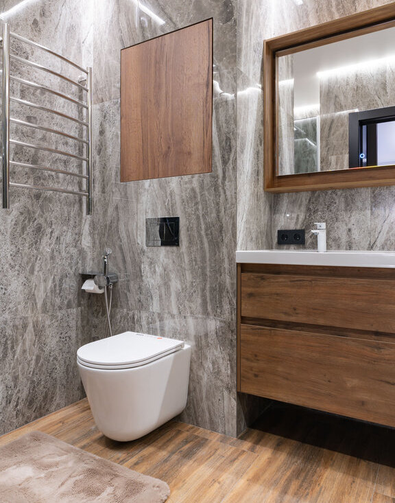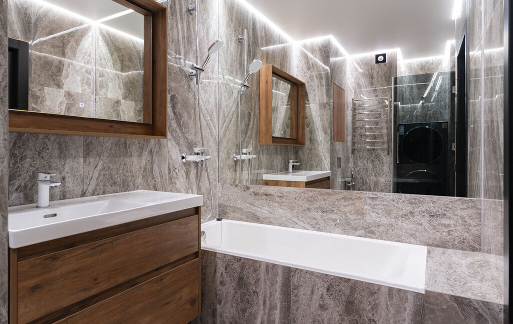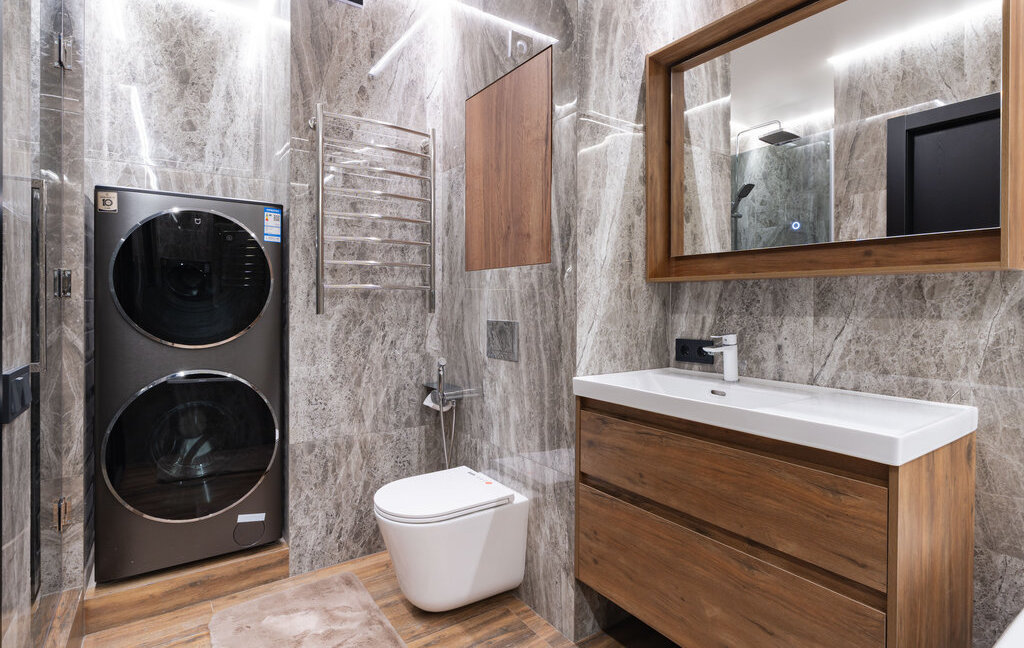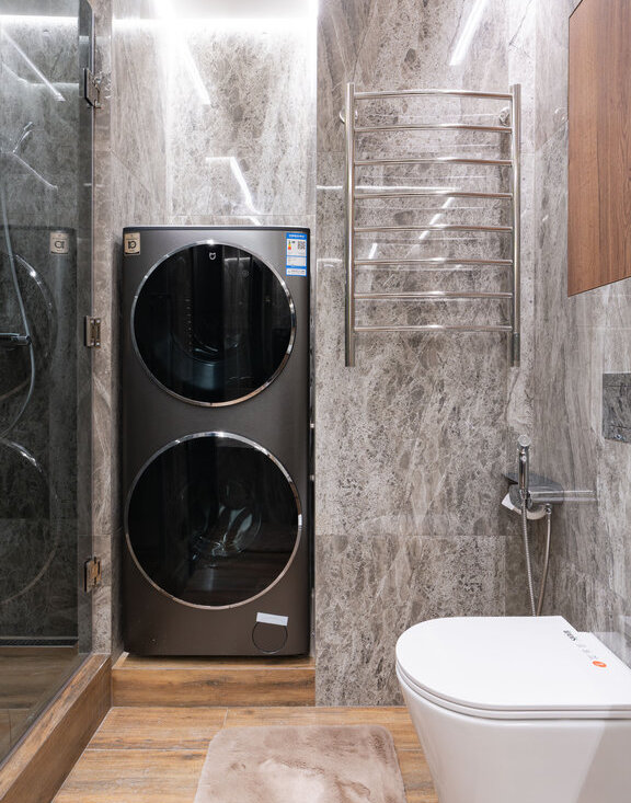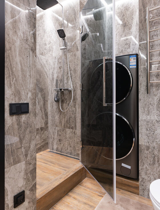 Просторный санузел выполнен в современной отделке: крупноформатная плитка, встроенная подсветка, качественная сантехника. Предусмотрены ванна и душевая зона со стеклянным ограждением, тёплый пол. Отдельно организована прачечная зона — установлены стиральная и сушильная машины, встроенные в интерьер.