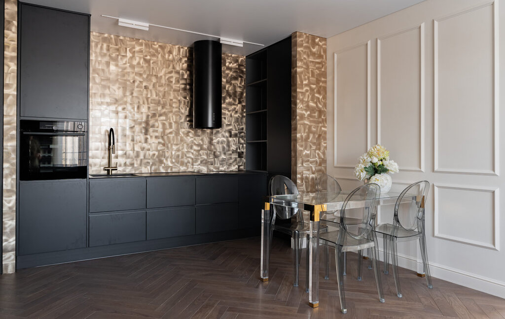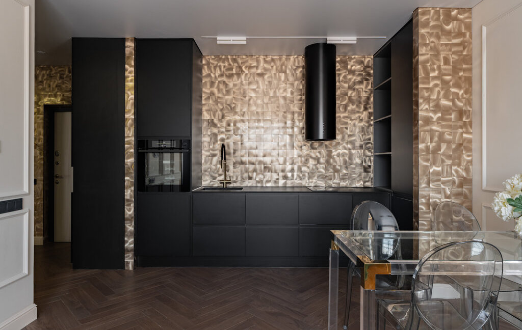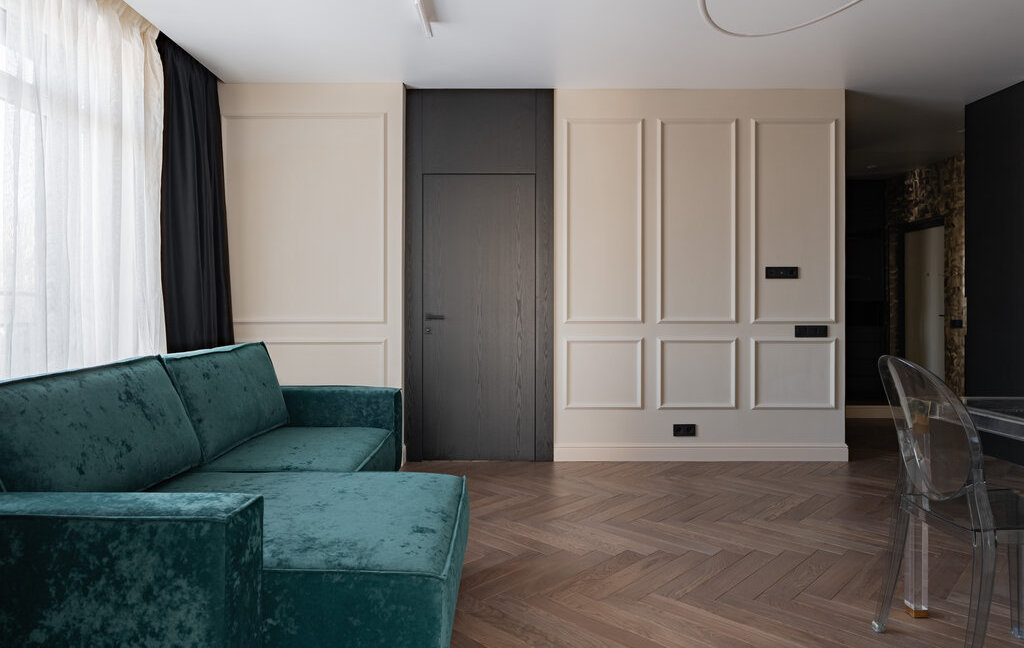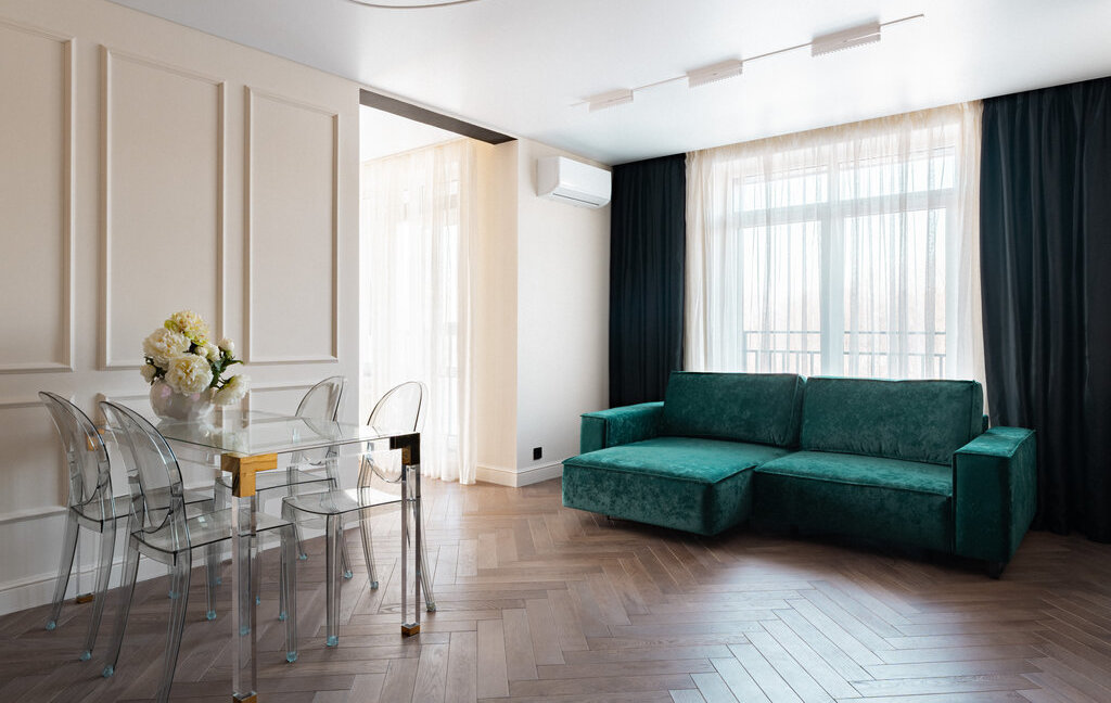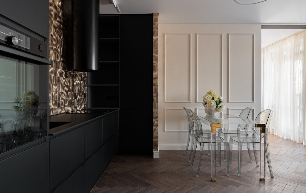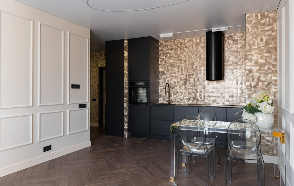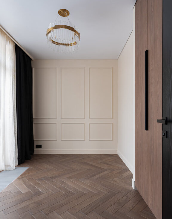 Планировка объединяет кухню и гостиную в единое функциональное пространство. В отделке использованы качественные и тактильно приятные материалы: натуральная инженерная доска (не искусственный пол), аккуратная классическая отделка стен, продуманный многоуровневый свет с различными сценариями. Интерьер выглядит цельно и сдержанно, подходит для повседневного проживания.