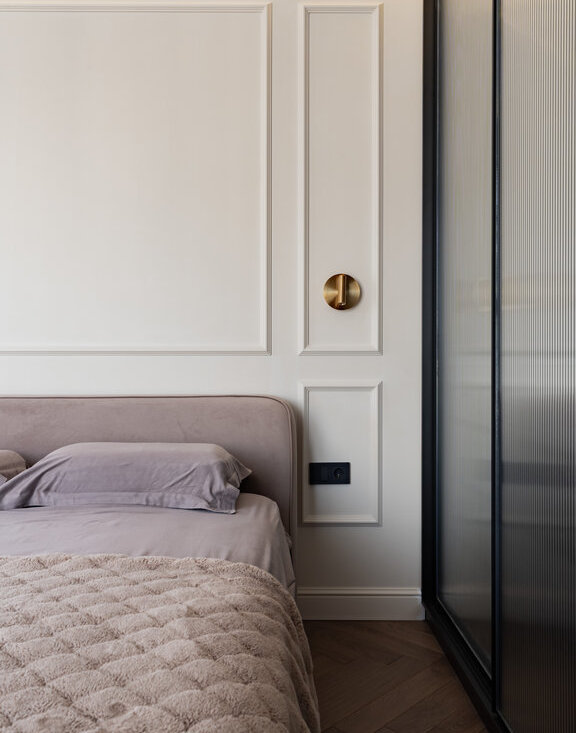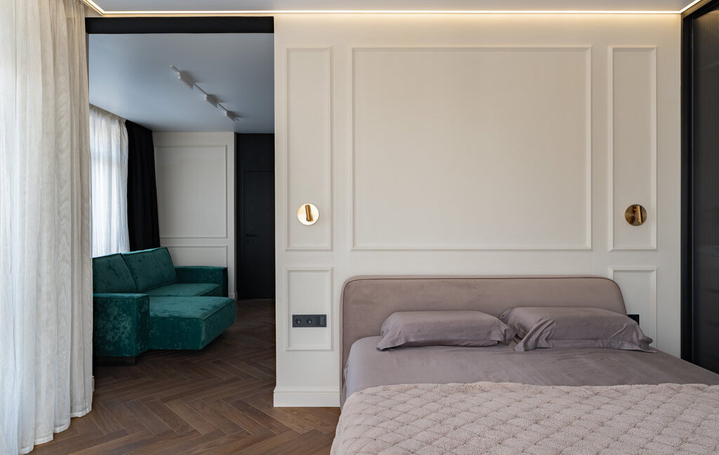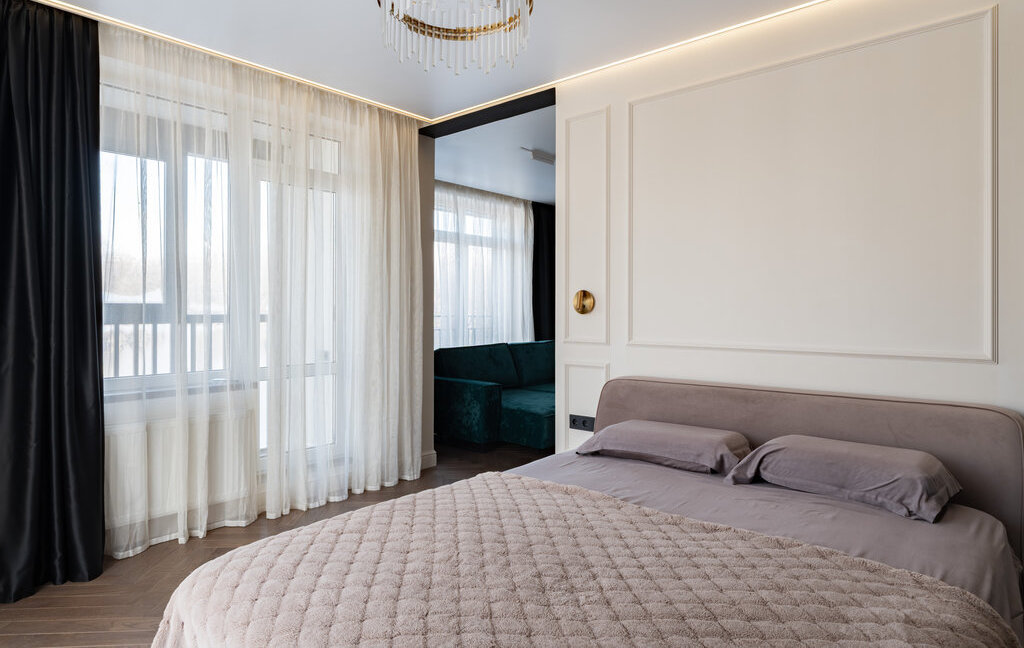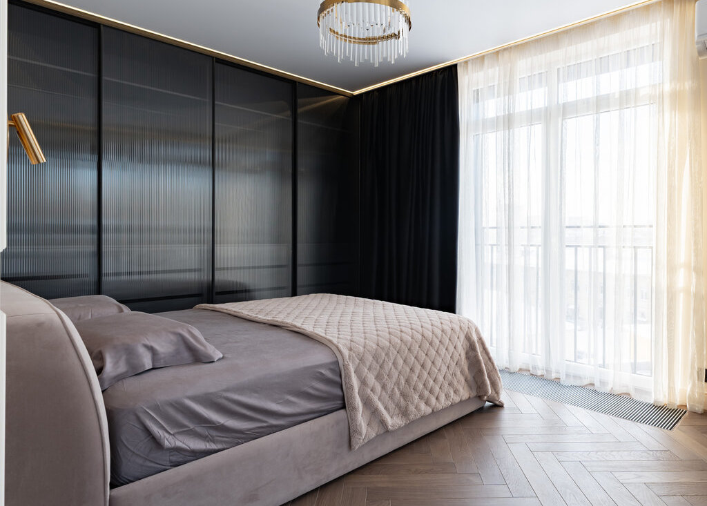 Спальня — отдельное, тихое пространство для отдыха. Установлена полноценная кровать с мягким изголовьем и премиальным ортопедическим матрасом размером 180×200 см, обеспечивающим комфортный сон, а также встроенная система хранения во всю стену с затемнёнными фасадами. Большие окна обеспечивают хорошее естественное освещение, плотные шторы позволяют полностью затемнить помещение. В спальне также установлен кондиционер.