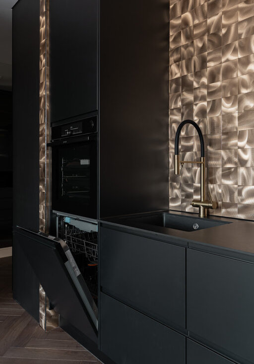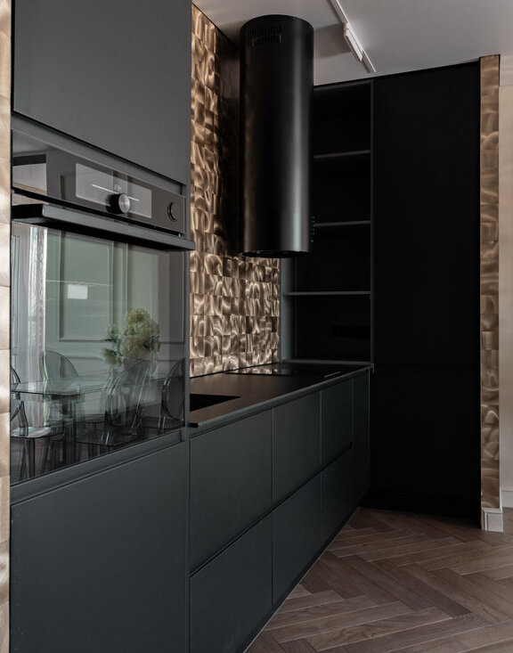 Кухня выполнена на заказ и полностью укомплектована встроенной техникой: духовой шкаф, варочная панель, посудомоечная машина, холодильник. Все элементы органично встроены и удобны в ежедневном использовании.