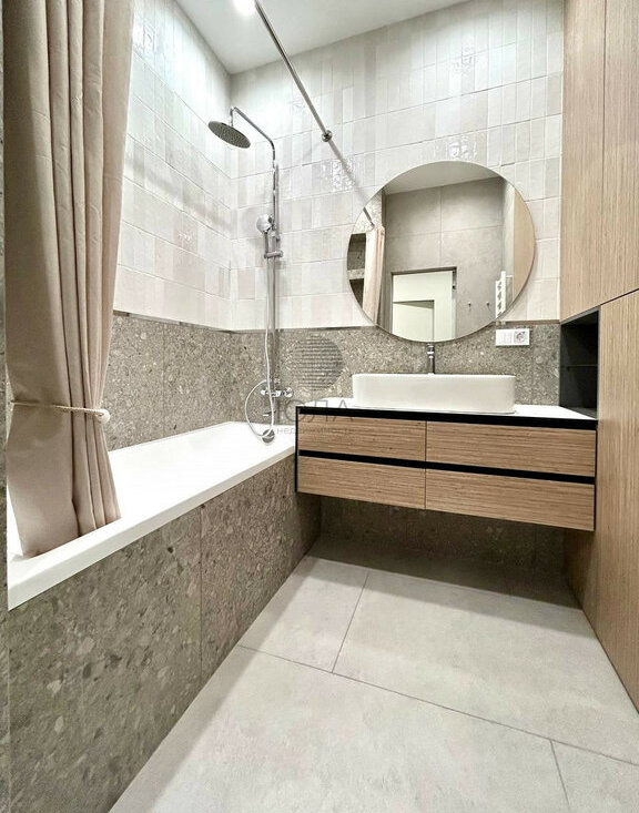 О планировке:Общая площадь: 87,9 м²Кухня-гостиная: 14,7 м²Две изолированные комнаты: 24 м² и 24,7 м²Два санузлаПросторный коридор: 18,1 м²Панорамные окнаБалкон: 3,5 м²Высокие потолки: 3 метраНовый ремонт (никто не жил в квартире)Квартира оборудована новой мебелью и всей необходимой техникойРасположена на 3-м этаже