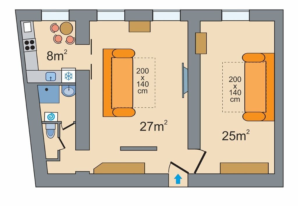 Апартаменты состоят из большого холла-гостиной, спальни, кухни и раздельного сан. узла. Общая площадь квартиры составляет 78,4 м2.