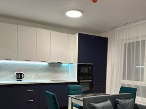 Кухня — светлая, полностью укомплектована всей необходимой техникой: варочная панель, духовой шкаф, холодильник, посудомоечная машина и микроволновка.