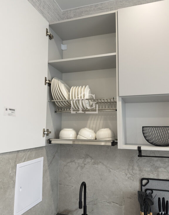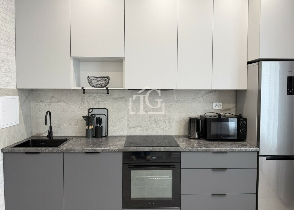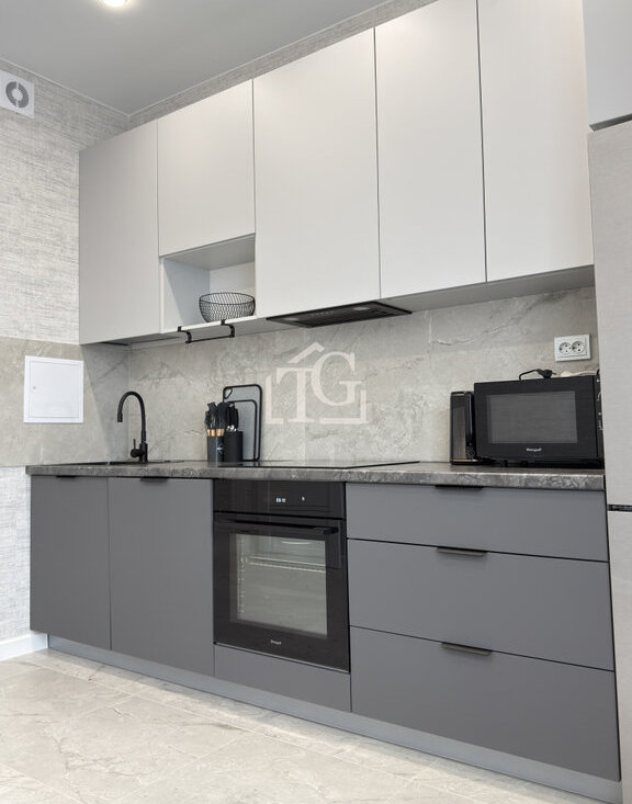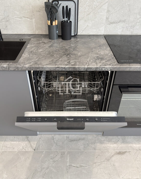 Кухня полноценно оснащена рабочим пространством и всеми необходимыми электро-приборами: холодильник, духовой шкаф, электрическая плита, микроволновая печь, чайник и посудомойка;
