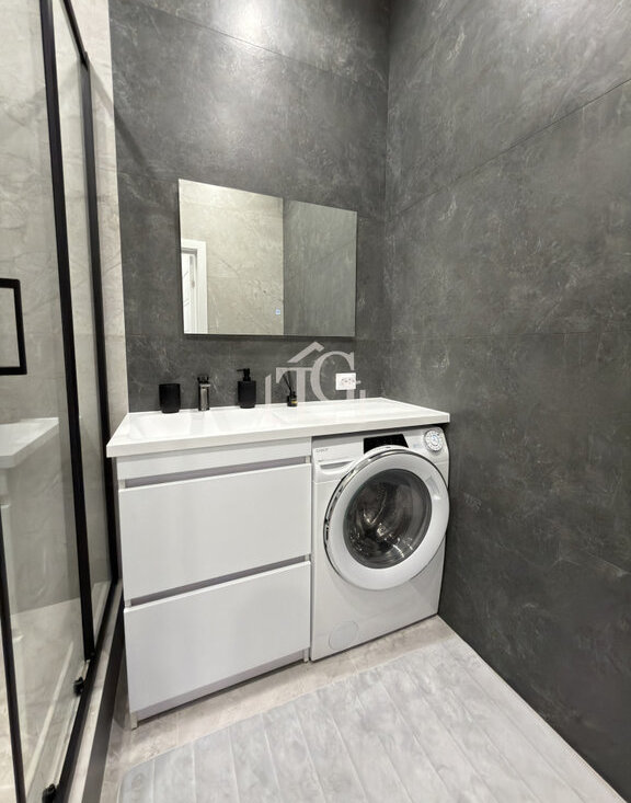 Просторная ванная комната со стильной и комфортной душевой кабиной, локанично вписанной в пространство стиральной машиной;