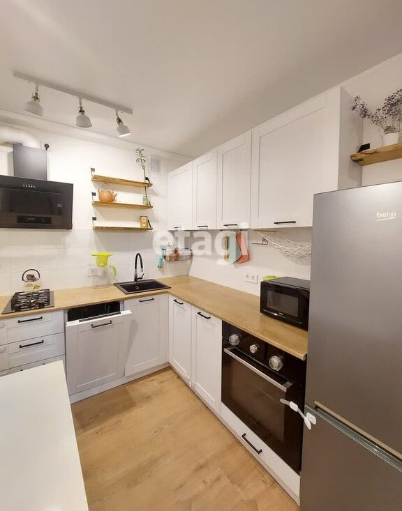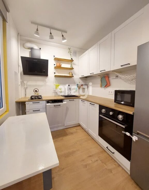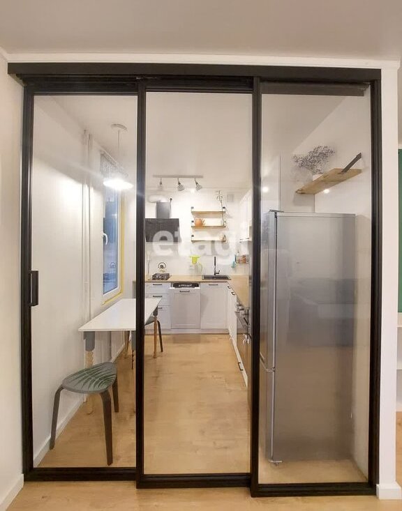 Планировка включает изолированную кухню с функциональной перегородкой, полностью укомплектованную встроенной техникой, включая посудомоечную машину.