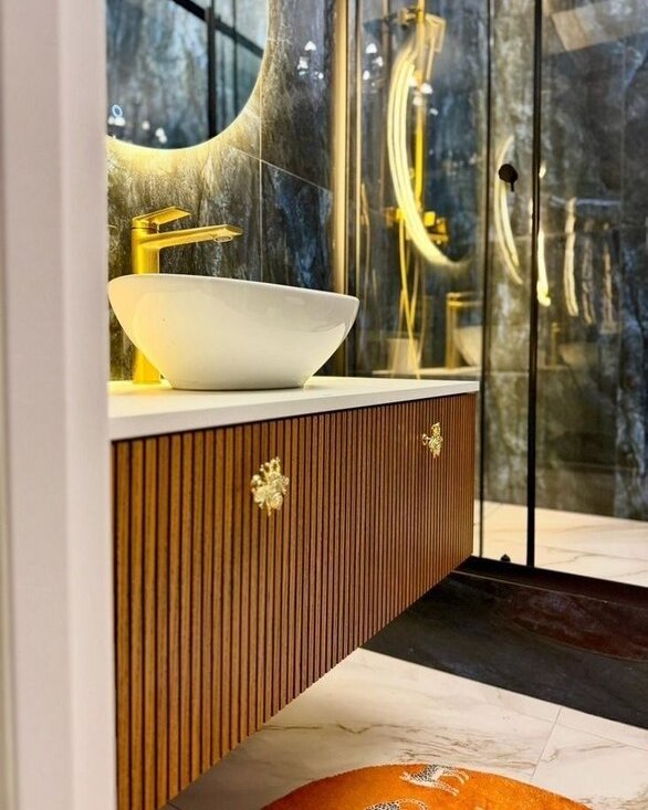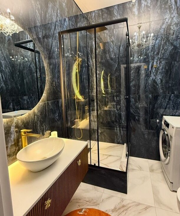 Ванная комната совмещенная, оформлена в современном стиле с использованием мраморных плиток и современной сантехникой.