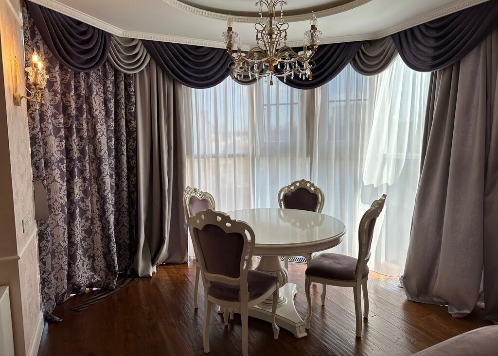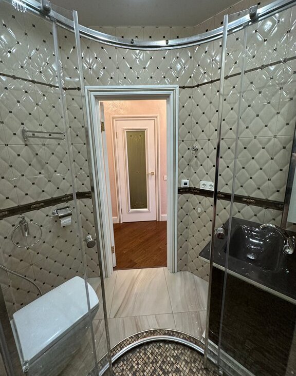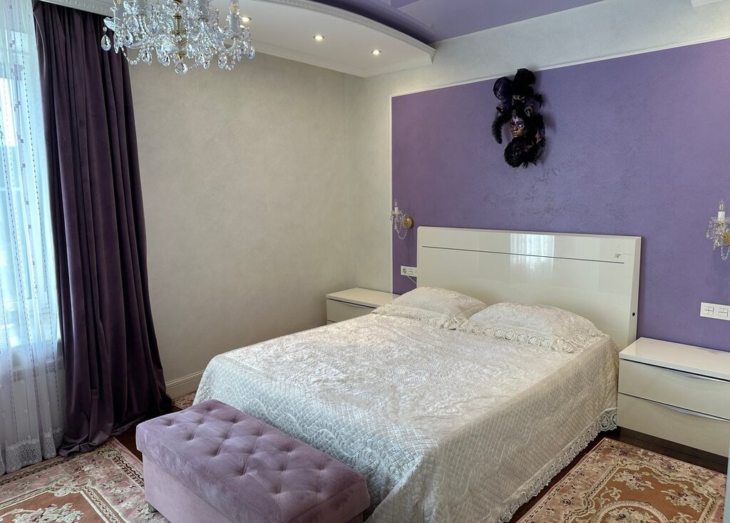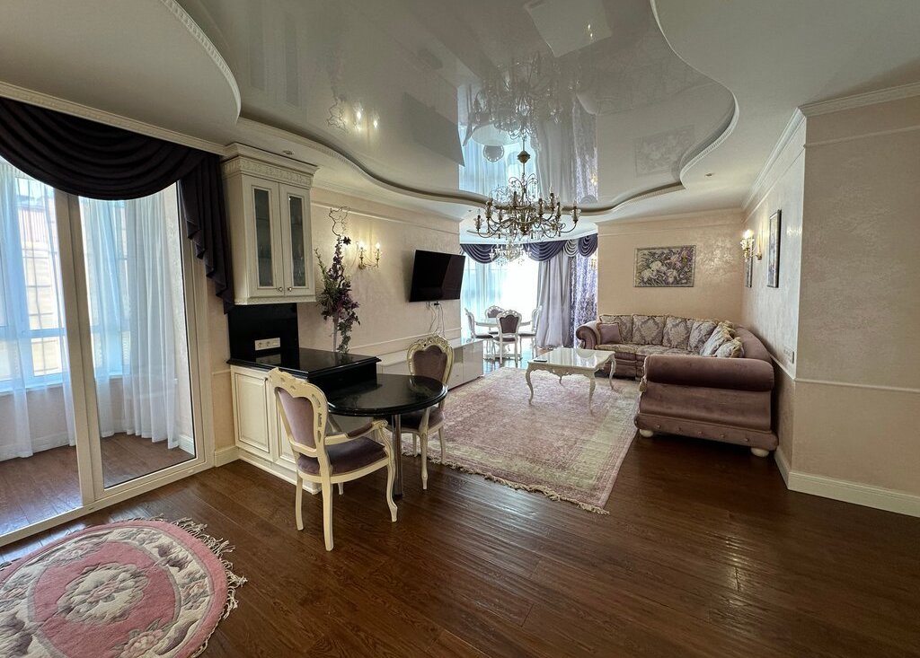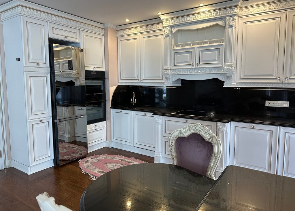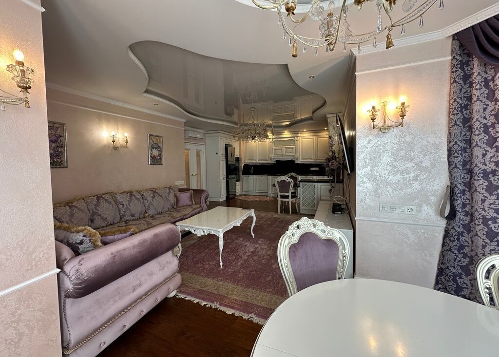 Она продуманно разделена на несколько зон. Кухня полностью укомплектована: холодильник, духовой шкаф, варочная панель, мощная вытяжка, посудомоечная машина, отдельно есть встроенная морозильная камера, множество мест для хранения, установлен кондиционер. Зона гостиной с большим угловым диваном, а также столовая зона у окна с большим раскладным круглым столом - для уютных вечеров и приема гостей.