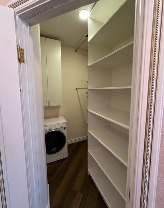 Отдельная гардеробная с встроенным шкафом до потолка и стиральной машиной избавляет от лишних вещей в жилых зонах.