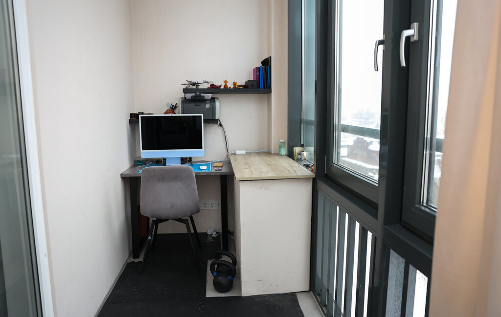 Утепленный балкон, превращенный в уютный мини-кабинет идеально подходит для работы или учебы;