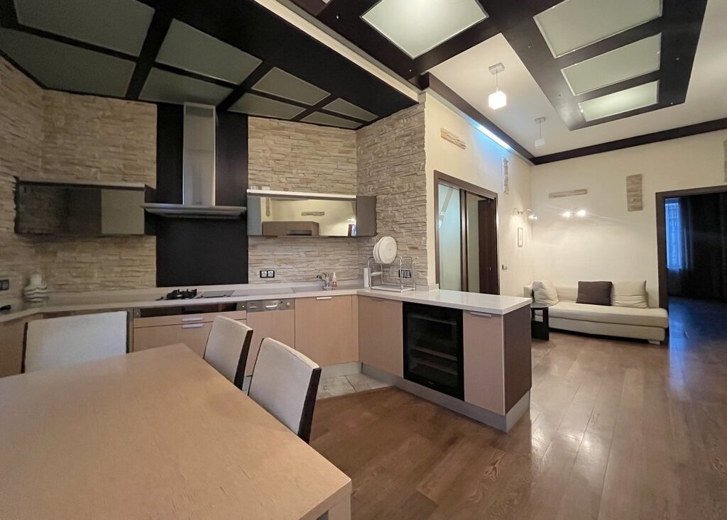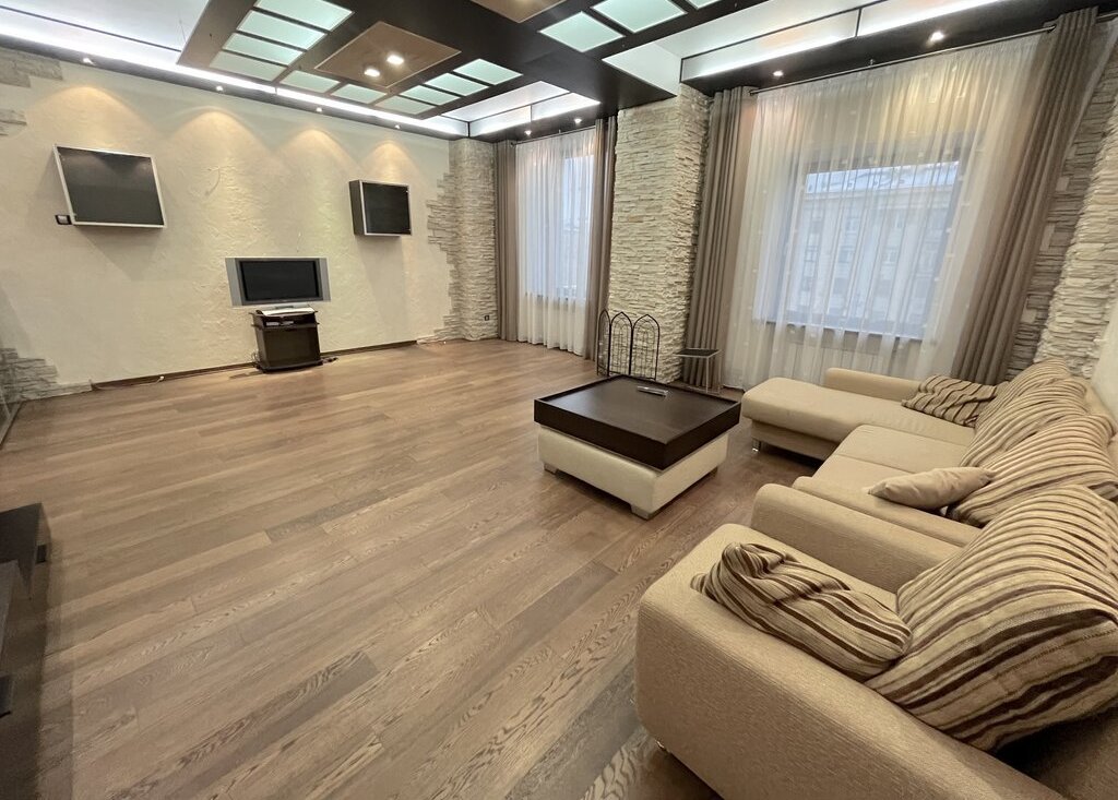Достойная квартира в сталинском доме с хорошим видом и дизайнерским ремонтом, делали для себя из качественных материалов. Общая площадь квартиры 105 кв.м. Кухня-столовая -26 кв.м., Гостиная - 38 кв.м., Спальня - 17,5 кв.м. с балконом и вместительной гардеробной. Есть необходимая мебель, вся техника фирмы "Miele". В парадной есть охрана, установлен новый лифт. Высота потолков -3,3м.
