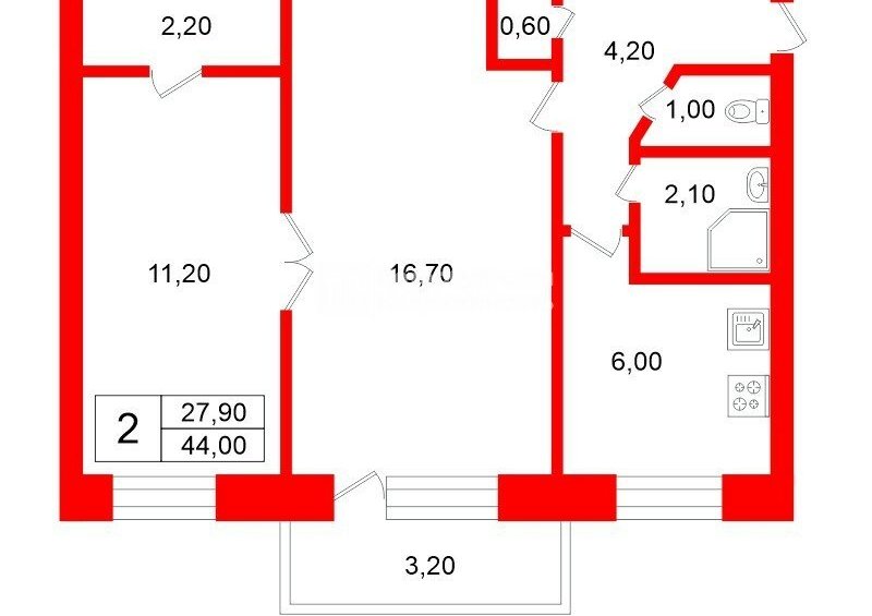 2-комнатная квартира: Санкт-Петербург, Московский район, Авиационная улица, 36 (44 м²)