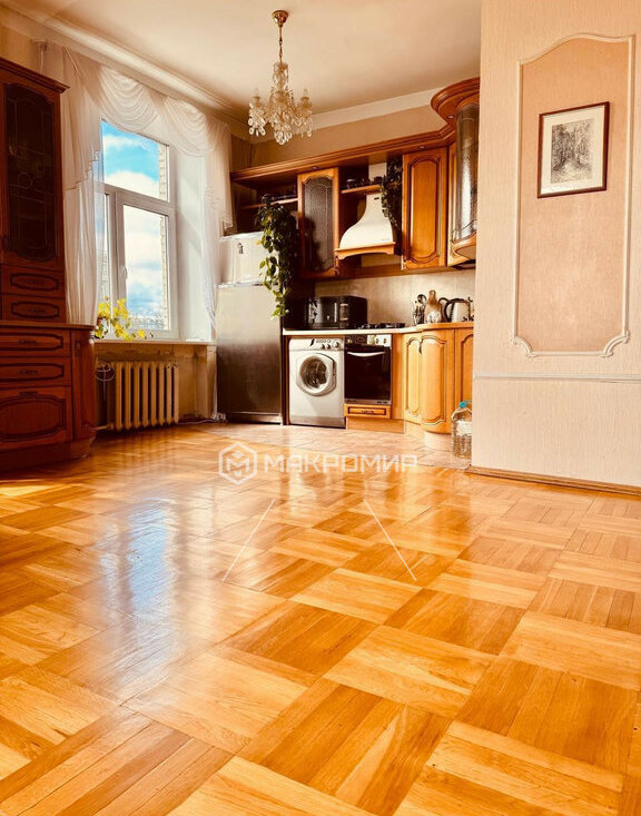Общая площадь квартиры составляет 87 квадратных метров, из которых 35 квадратов занимает кухня-гостинная.