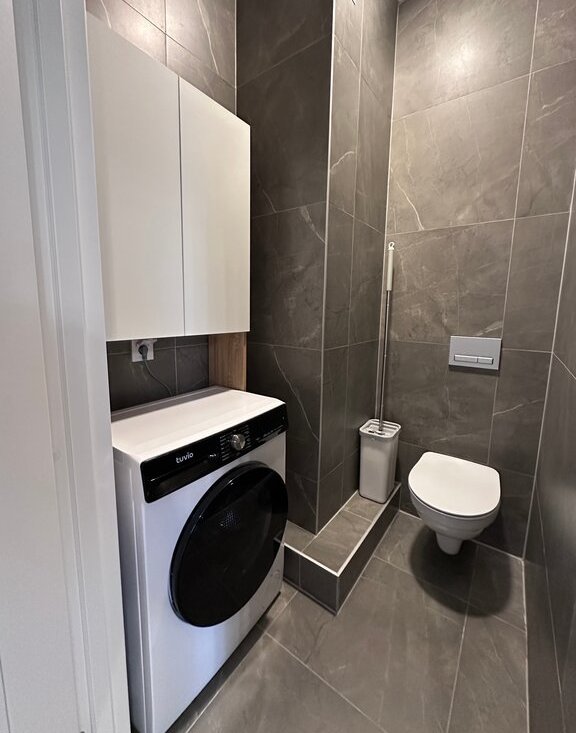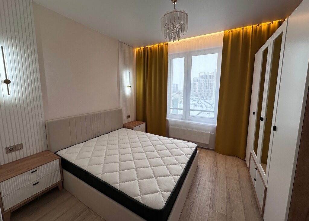Квартира состоит из просторной кухни-гостиной, спальни с полноценной двуспальной кроватью, кабинета/спальни с раскладным диваном, двух санузлов и лоджии с окнами во двор. В сан узле установлен теплый пол. Квартира оснащена всем необходимым для комфортного проживания.