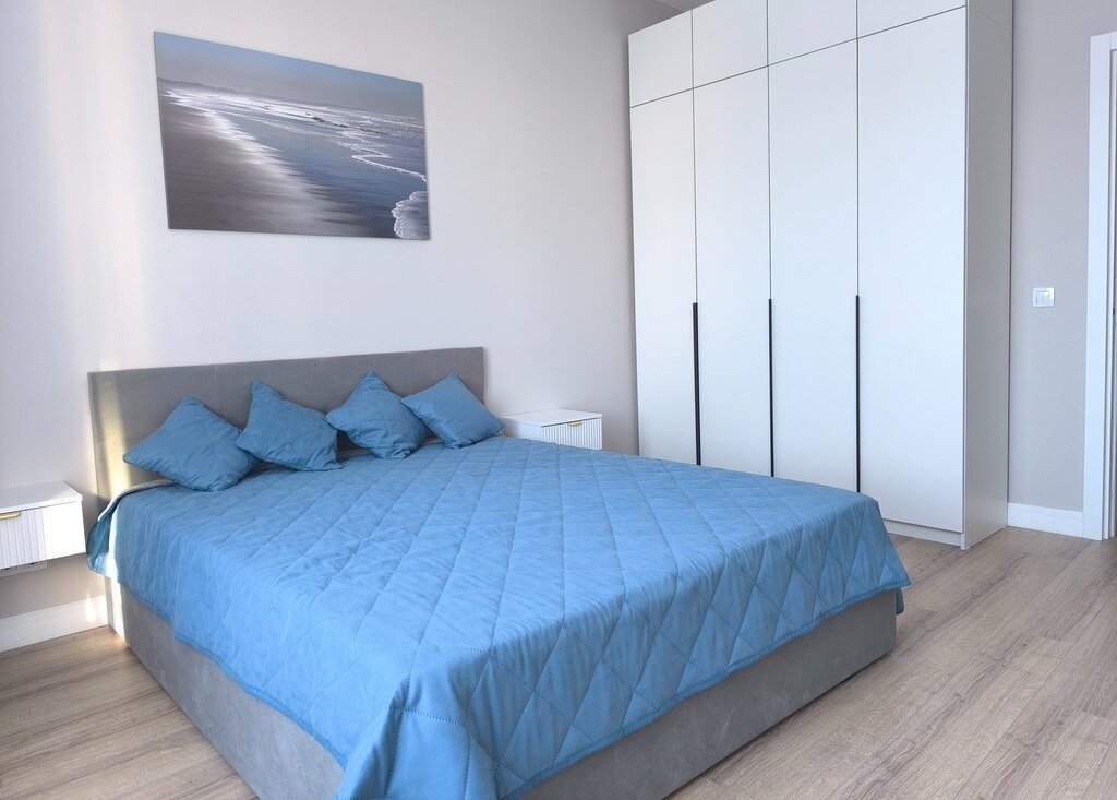В спальне стоит двуспальная кровать 160х200 с новым ортопедическим матрасом. В обеих комнатах установлены вместительные шкафы. Вторая комната может быть использована как кабинет или детская, при необходимости установим односпальную кровать 90х200.