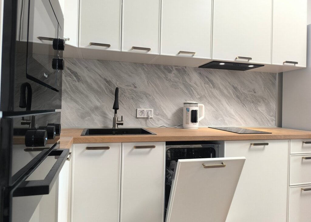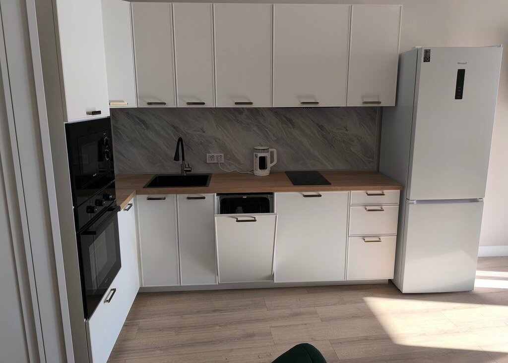 Кухня оборудована всей необходимой бытовой техникой Weissgauff, а также большим телевизором 55”. Из кухонного окна открывается вид на Финский залив. Большой балкон с панорамными окнами позволит каждый день любоваться потрясающими закатами.