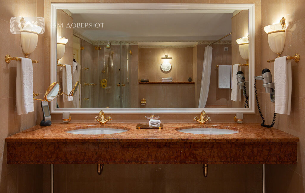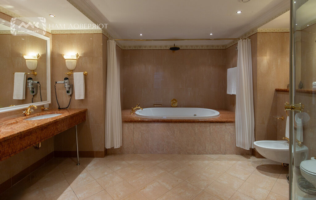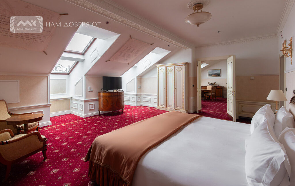 В отделке использованы эксклюзивные материалы: обои из шелковой ткани, оникс, мрамор, винтажная мебель.