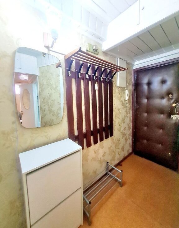 Для вещей есть два шкафа в комнатах - большой угловой шкаф с зеркальной дверью, высокий комод, встроенная антресоль в прихожей и открытая вешалка.