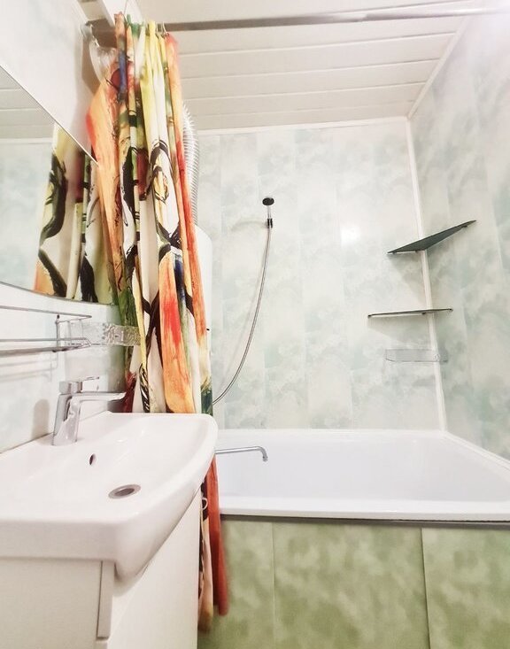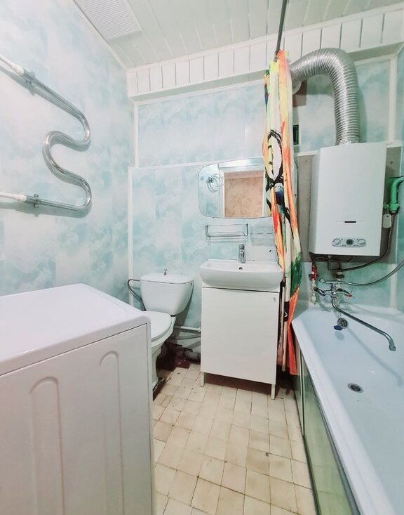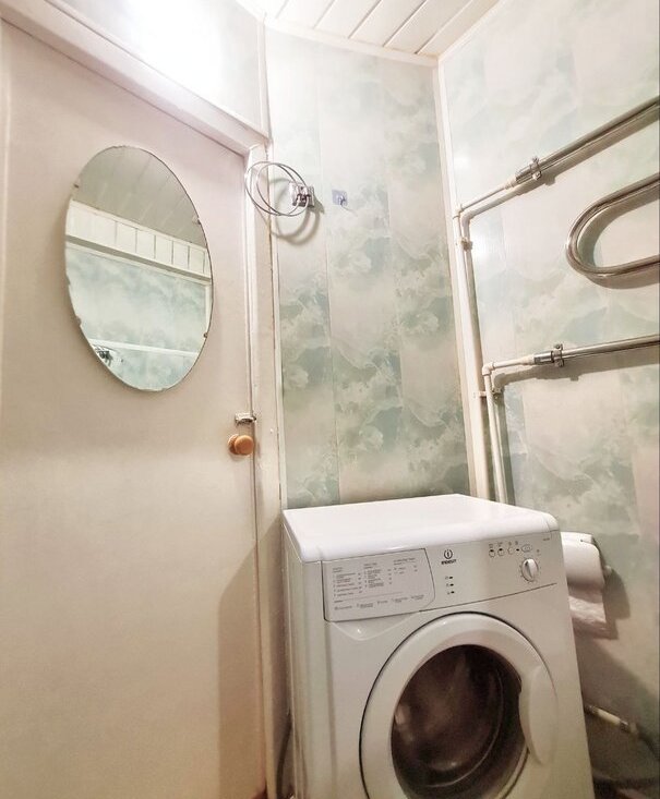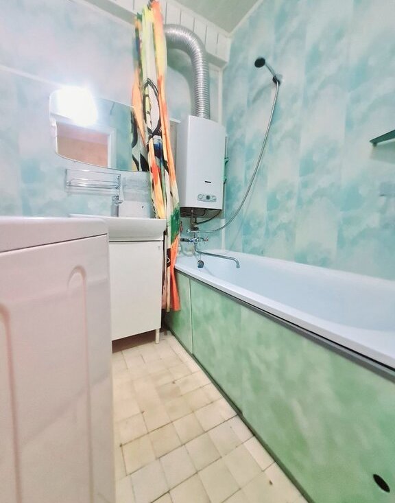 На кухне свч, плита с духовкой и вытяжкой, кухонная мебель. Ванная выложена кафелем, есть стиральная машинка, сушилка, ванная.