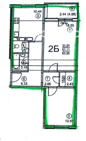 Общая площадь 61 кв. м. Кухня - 10,4 кв.м. Комнаты: 18,5 и 12,5 кв.м. Лоджия 5 кв.м. Гардеробная 2,4 кв.м. Высота потолков - 2,8 м. В доме 2 лифта: грузовой и пассажирский.