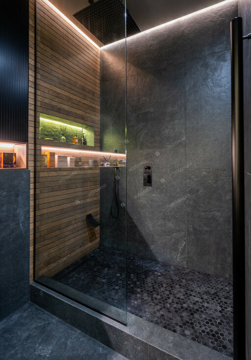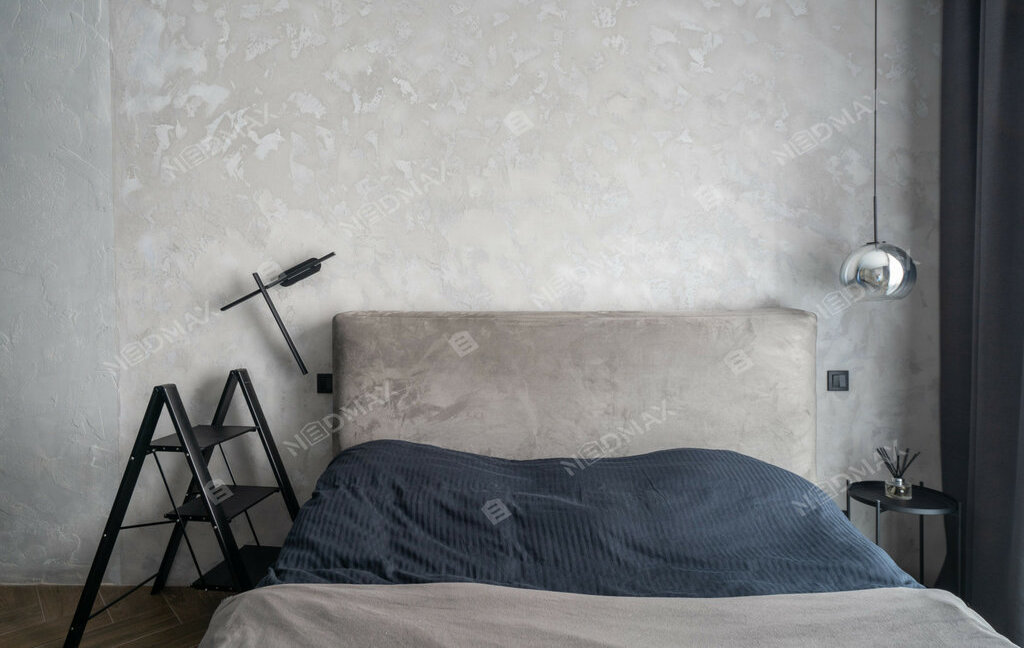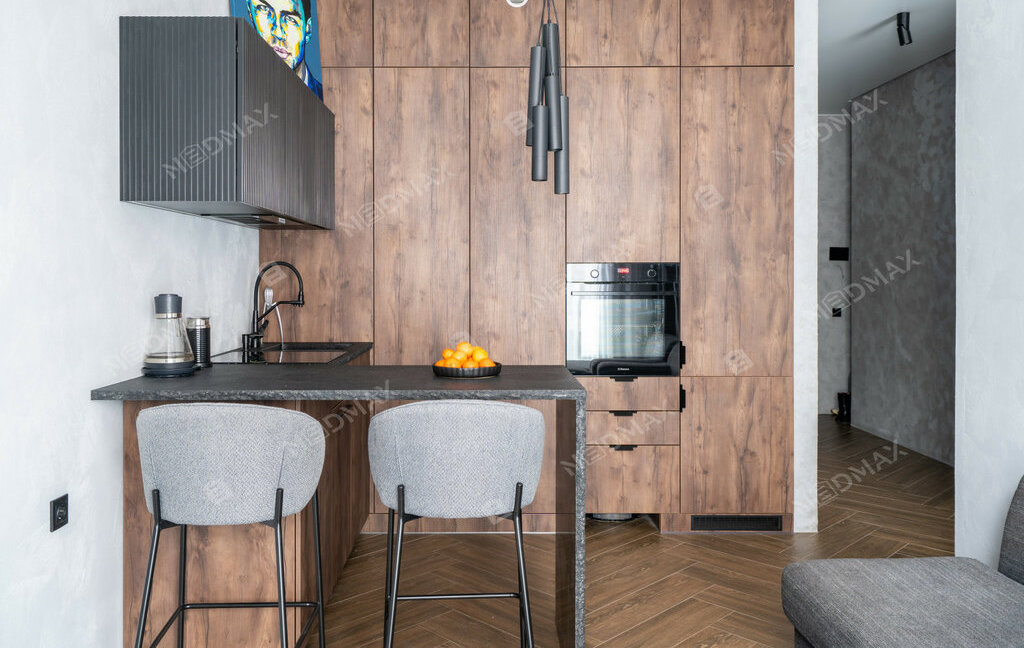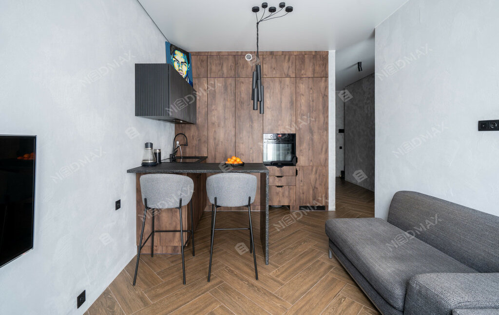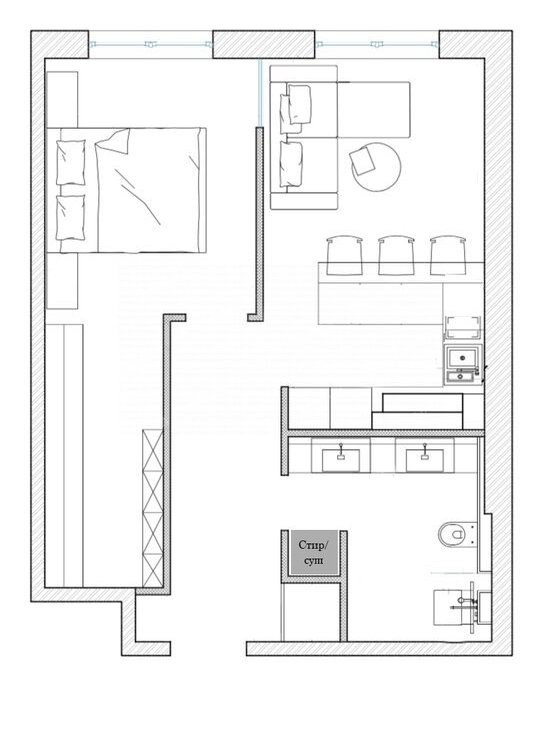Планировка включает: Спальню с гардеробом, большой объединенный санузел с тропическим душем, и кухней-гостиной.