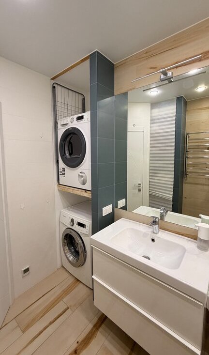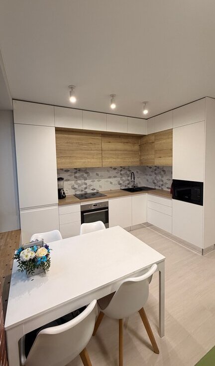 — кухня со всей необходимой техникой и большим количеством систем хранения.