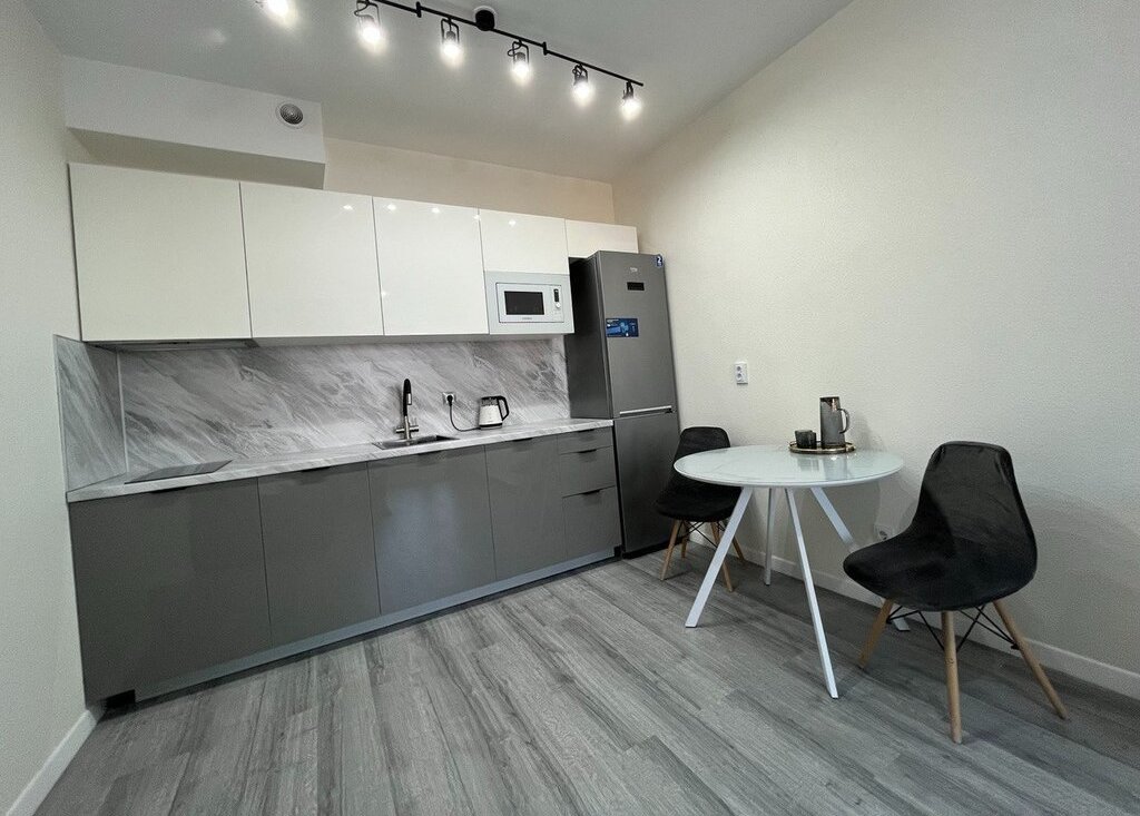 Кухонная зона с техникой: холодильник, плита с 2 конфорками, вытяжка, микроволновка, чайник, обеденный стол и стулья.