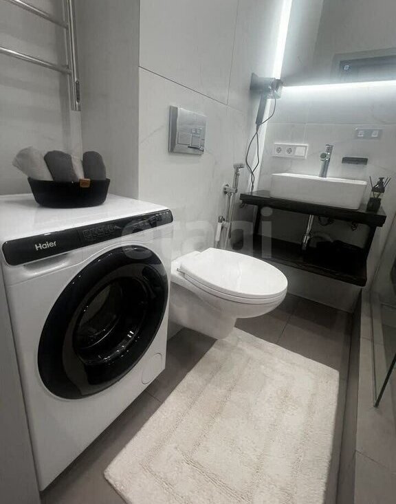 • Санузел: совмещённый, с современной сантехникой и стиральной машиной.